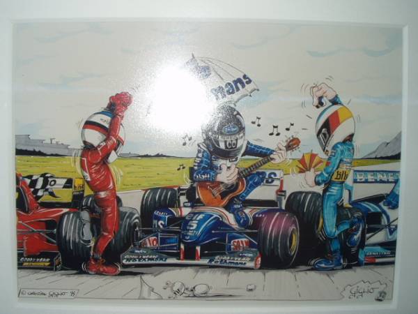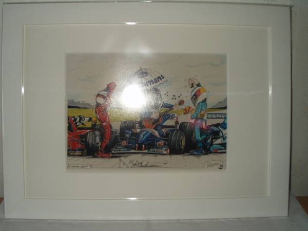 F1 D.ヒル J.アレジ M.シューマッハ イラスト版画 額装 新品即決です。イラストは、1995年にウイリアムズ ルノーのデーモン.ヒルが優勝したのを、フェラーリのジャン.アレジとベネトンのM.シューッマハが祝っている姿を現しています。額装大きさ約縦310mm横415m、イラスト大きさ約縦167mm横225mmです。イラスト版画ははプロが書かれた美しい物です。※提示の写真はビニールの上から撮影しています。安価提供ですので、ノークレーム、ノーリターンでお願い致します。発送は、ゆうパックになります。