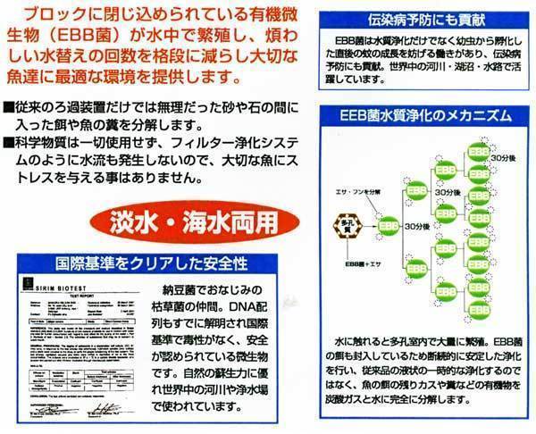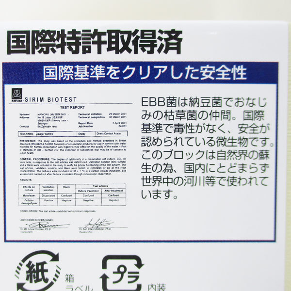 熱帯魚水槽や金魚水槽等の水槽浄化のためのバイオミニブロックに含まれるEBB菌は、納豆菌でおなじみの枯草菌の仲間で、国際基準をクリアして毒性もなく、安全が認められている微生物です。自然の蘇生力に優れ、世界中の河川や浄水場で使われています。また、淡水・海水のどちらにも対応します。