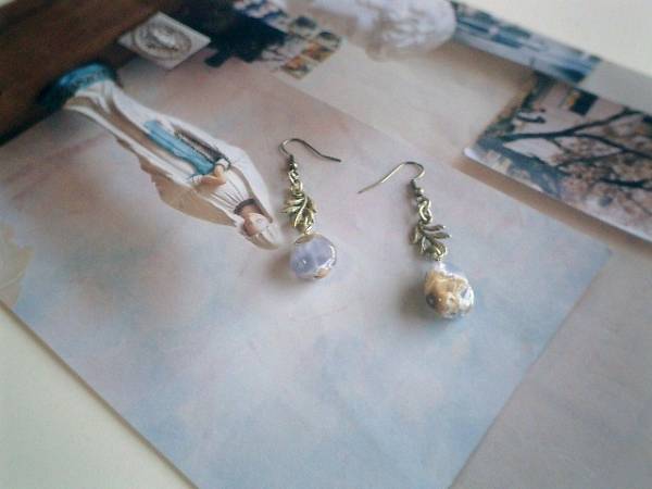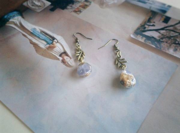 天使の時間・・シリーズです♪神秘的なブルー・・神秘的なブルーカルセドニーのピアスです♪母岩のついた表情豊かなブルーカルセドニーのラフカットやシックなチャームを合わせてロマンチックしています♪カルセドニーは15ミリ位のラフカットです♪長さは全長6センチ位です♪イヤリングにも変更出来ます♪お揃いのネックレスやブレスレットも出品しています♪シンプルで飽きのこないいつまでも着けられるデザインを考えて作りました!ハンドメイドをご理解頂いてノークレーム、ノーリターンでお願いします