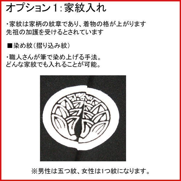 | 紋入れ フードセット | ・紋入れ可能です。 別途6600円にて承ります。5日間ほどお時間をいただきます。 ※家紋は染め紋(摺り込み紋)になります。 ・フードセットも同梱可能です 別途4800円でご用意できます。 ※ご要望のお客様は家紋名、もしくはフードセット要望の旨をご明記のうえ、フォームもしくはメールaji_net@khaki.plala.or.jp までご連絡ください (家紋の画像をメールで連絡いただいても結構です) |