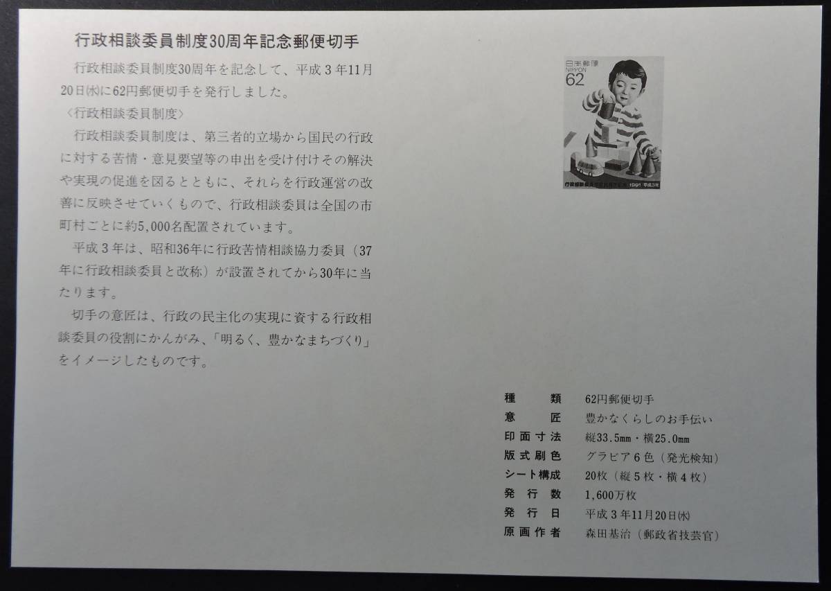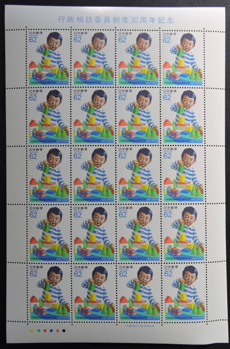 日本切手ー未使用美品 1991年行政相談委員制度30周年切手62円*20枚 1シート  添付切手の発売説明1枚(切手ではない!)