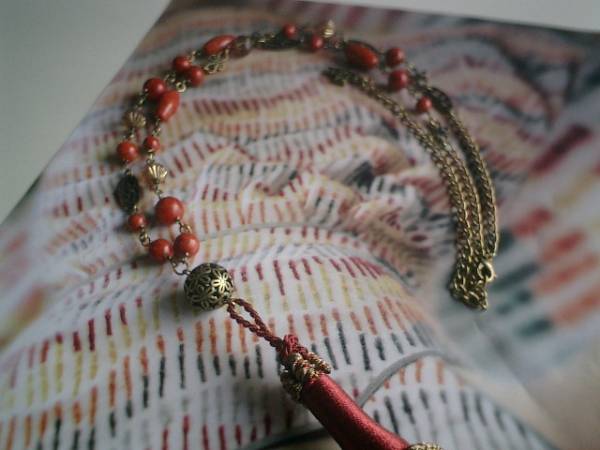 ネオ・ロマンチック・・シリーズです♪オリエンタルな赤・・シックな赤のスポンジ珊瑚のネックレスです♪チェコビーズや個性的なタッセルやメタルチャームを合わせてアンティーク・モダンしています♪スポンジ珊瑚は6ミリから20ミリ位までの丸玉やナツメ、トップのタッセルは10センチ位です♪長さは70センチ+アジャスター14センチで最長84センチ位です♪トップは15センチ位です♪お揃いのブレスレットも出品しています♪シンプルで飽きのこないいつまでも着けられるデザインを考えて作りました♪ハンドメイドをご理解頂いてノークレーム、ノーリターンでお願いします