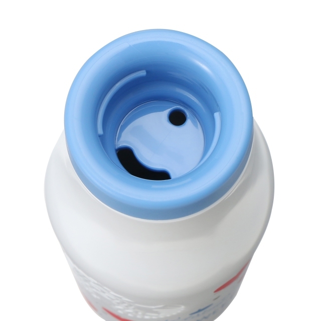 白いボディに赤いハートや青い文字を手描き風に描いた、スタイリッシュな雰囲気のステンレスボトルです。