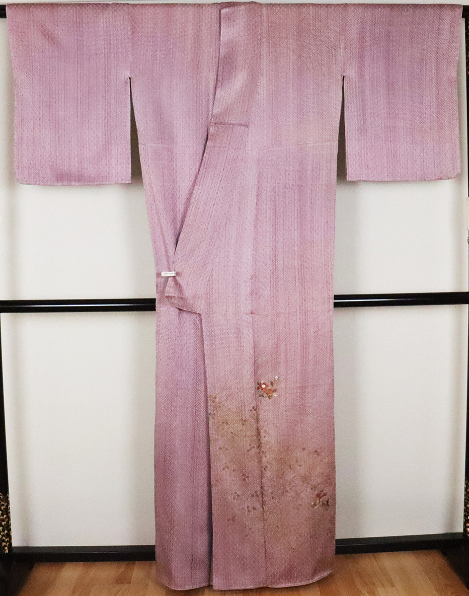 | 訪問着 袷 丹後縮緬地 絞り地 紫・薄緑ぼかし縦縞地絞り地 刺繍牡丹・金彩萩 169 広襟 | |