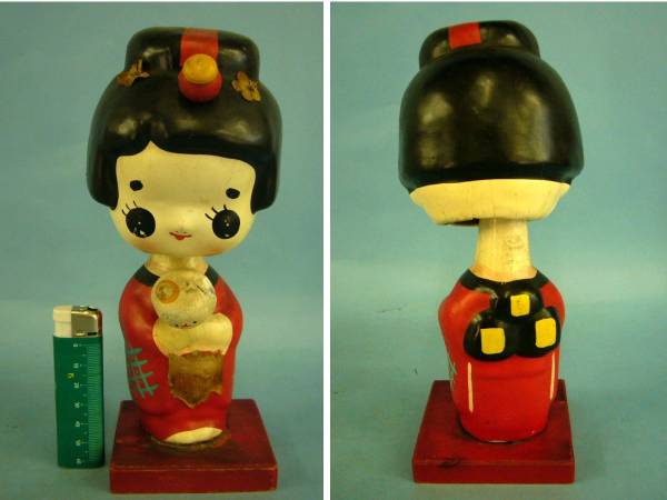 | 画像確認ジャンク品★古い・お団子髪・猫抱き着物娘・首振り人形・木台・昭和レトロ★ | |