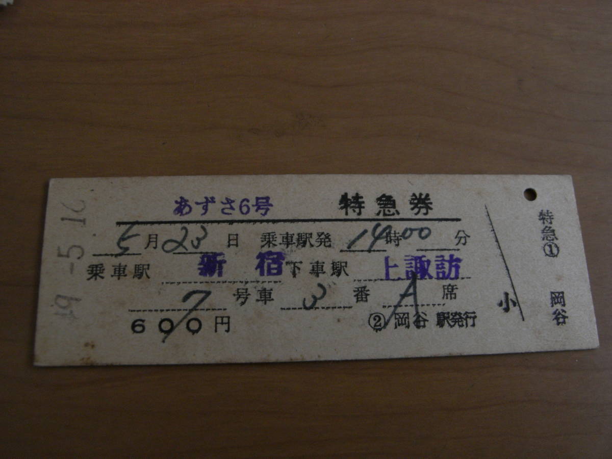 あずさ6号 特急券 乗車駅 新宿 下車駅 上諏訪 昭和49年5月16日発行 岡谷駅発行