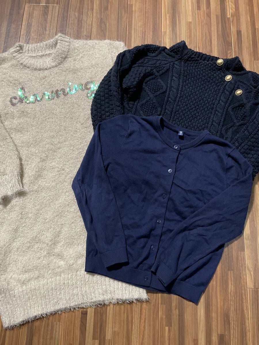 こちらは140cmのお洋服3枚セットです。画像左から、、、ベージュのブークレー素材チュニックワンピ(GU)右上、、、ネイビーのケーブル編み(ROPE)右下、、、ネイビーのカーディガン(ユニクロ)どれも子供が着用したお品ですが、まだまだ通学着としては着ていただける程度のお品です。あくまでもUSED品をご理解いただいた上での入札をお願いいたします。