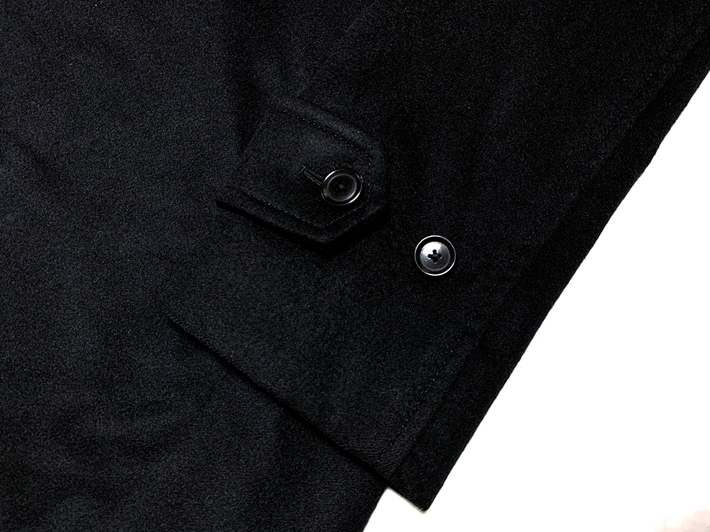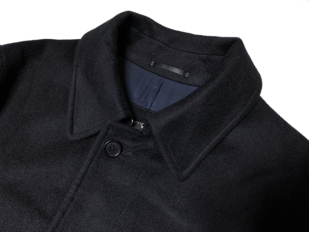 テーラリング技術を生かした立体的で美しい仕上がり、着用時に立体的なフォルムを演出しています。シルエットはコンパクト且つモダン、襟立ちの良いステンカラーなど計算された立体的な仕立てでややAラインの美しいシルエットです。