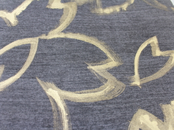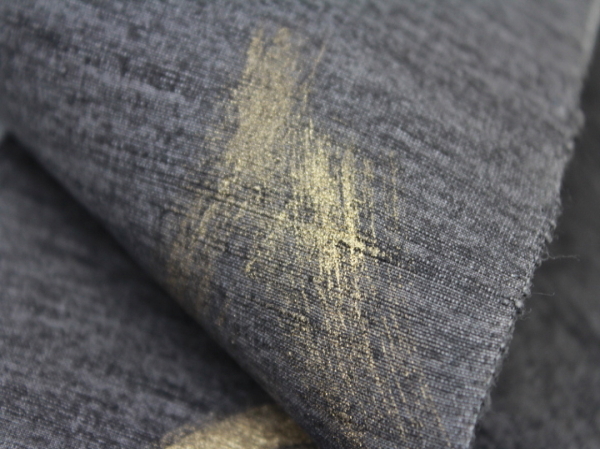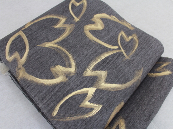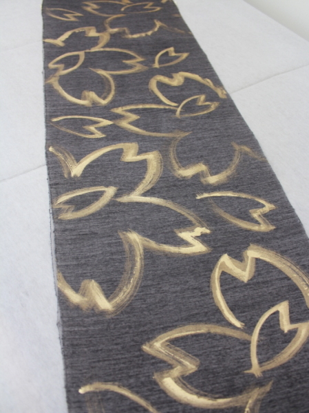 真綿紬地に墨染めし、金彩で桜を描いています。
