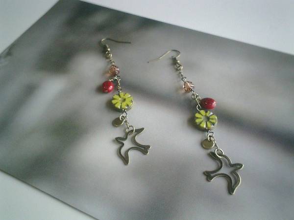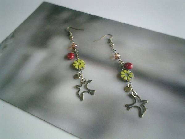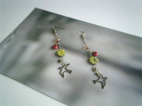 秋の小鳥さん・・シリーズです♪キャンディ・モチーフ・・キュートなチェコビーズやメタルチャームのピアスです♪透かしの小鳥さんを合わせてキュート・モダンしています♪チェコビーズはダークレッドのてんとう虫やお花模様などシックな秋色を合わせました♪長さは全長10センチ位で調節自由です♪イヤリングにも変更出来ます♪お揃いのネックレスやブレスレットも出品しています♪シンプルで飽きのこないいつまでも着けられるデザインを考えて作りました!ハンドメイドをご理解頂いてノークレーム、ノーリターンでお願いします