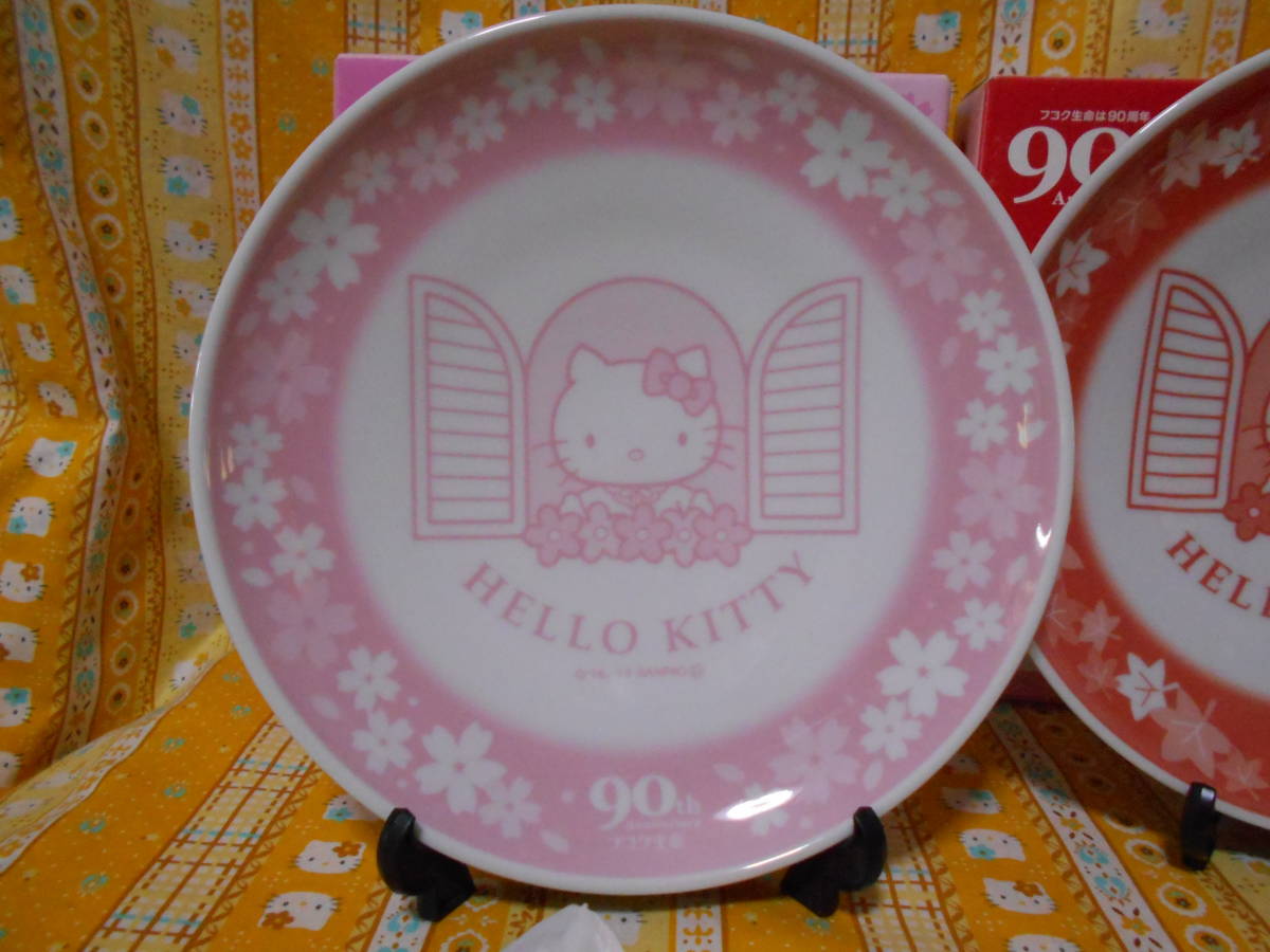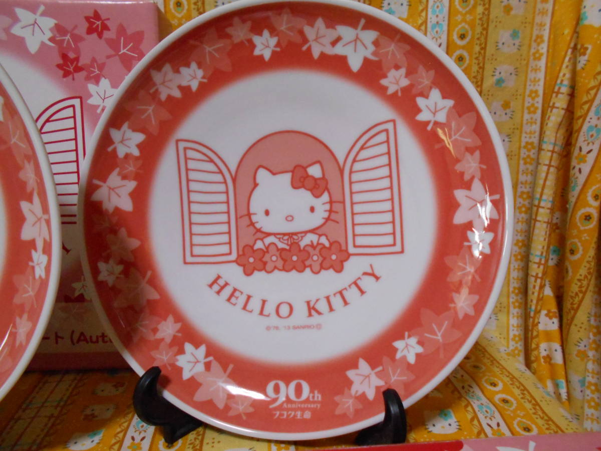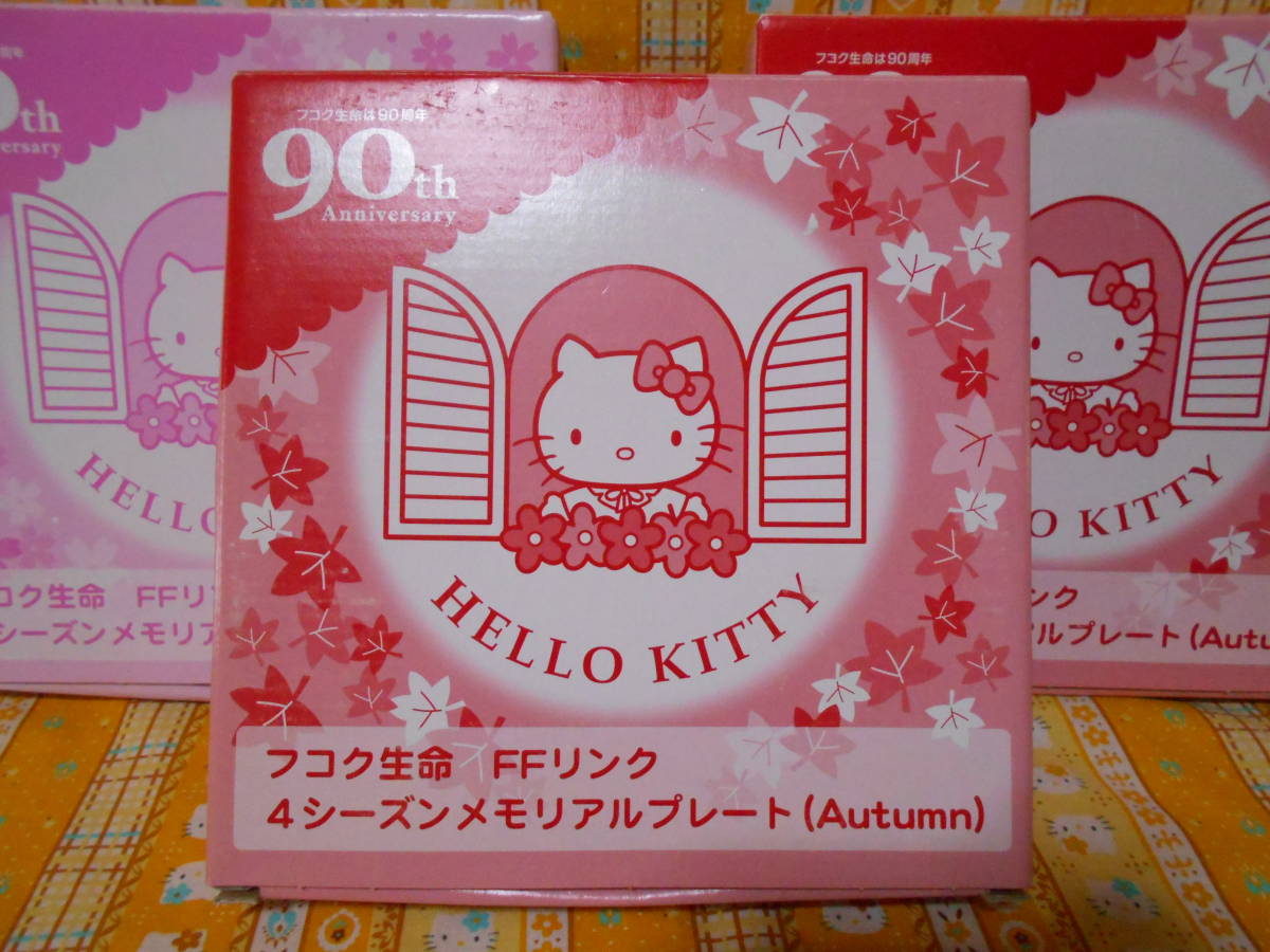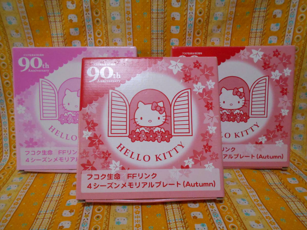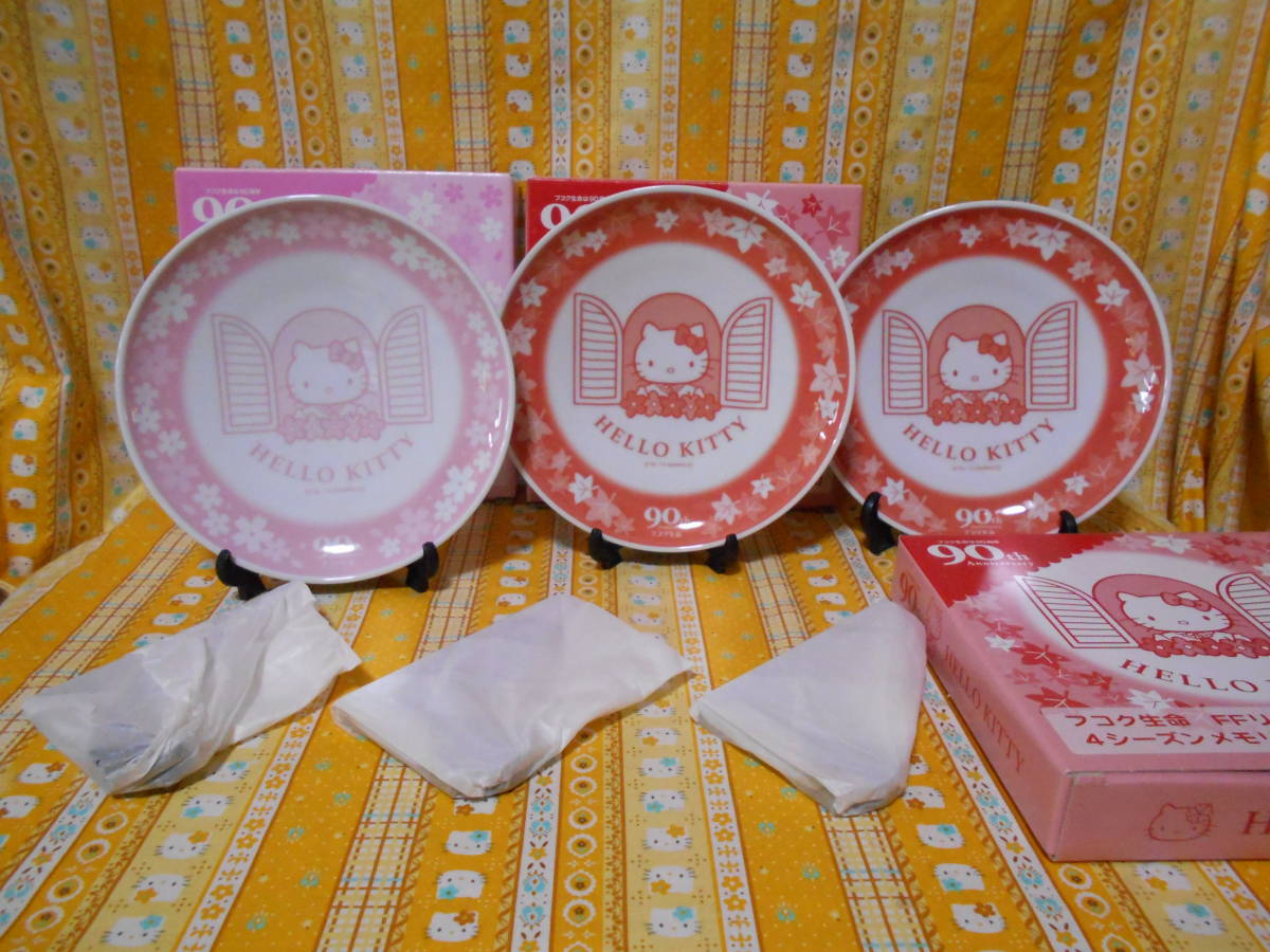 ♪キティ新品箱入りサンリオハローキティ皿立て付フコク生命90th4シーズンメモリアフプレート陶器製お皿2種3枚セット18.5cm