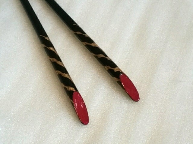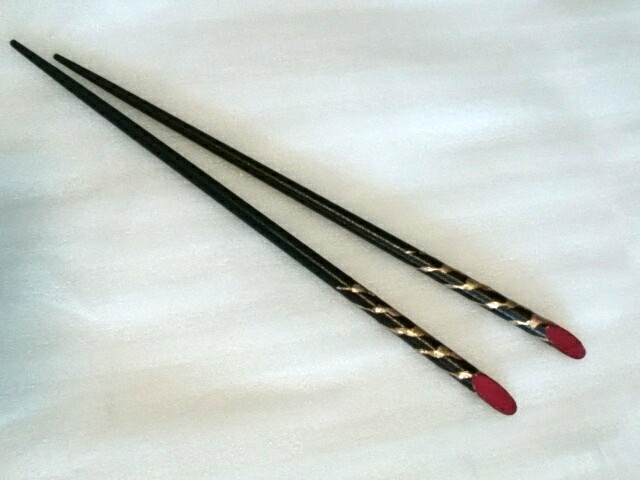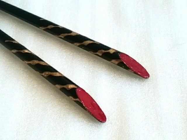 長さ約21cm、黒地に金色のねじり柄、トップは赤(朱赤ではなく暗めの赤)。