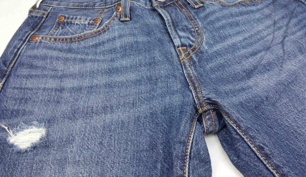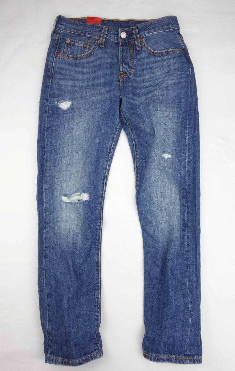 Levi's 501T TAPERのダメージ加工ジーンズです。 セール品ですので、在庫なくなり次第、終了させて頂きます。 新品/未使用/(保管ジワ、紙タグに初期ダメージあります。ご了承ください。) サイズ:W24 L28 平置き実寸です。 腰幅:約34cm 股上:約22cm 股下:約70cm 裾幅:約15cm 腿幅:約25cm | ||