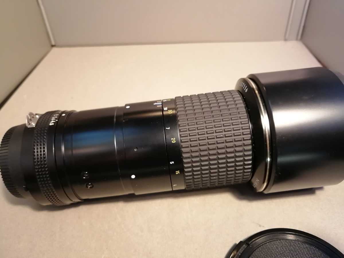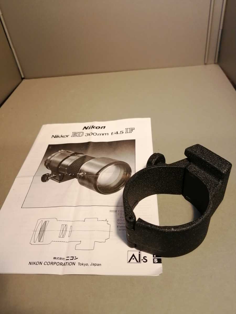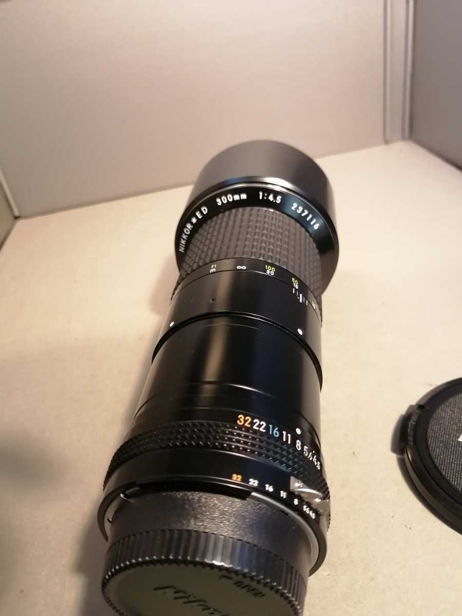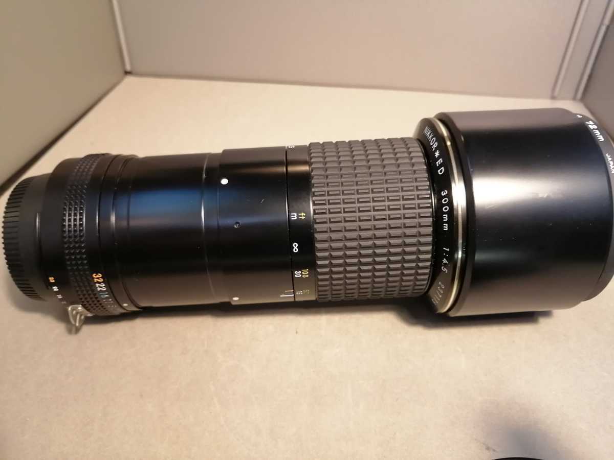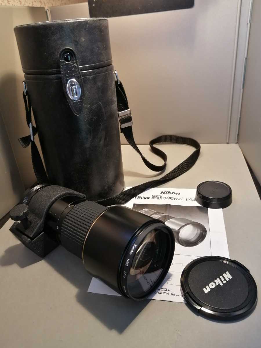 ニコンの一眼レフ用交換レンズNIKKOR ED 300㎜、1:4.5です。品番は237116、KENKO のフィルターMC UV SL -39が付属しています。ケースとホールドアダプター、説明書も付属します。