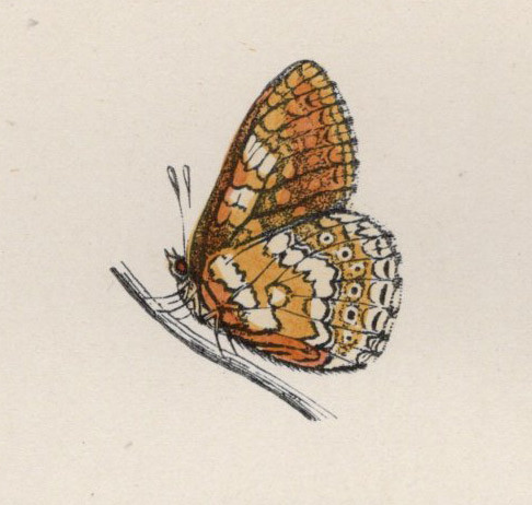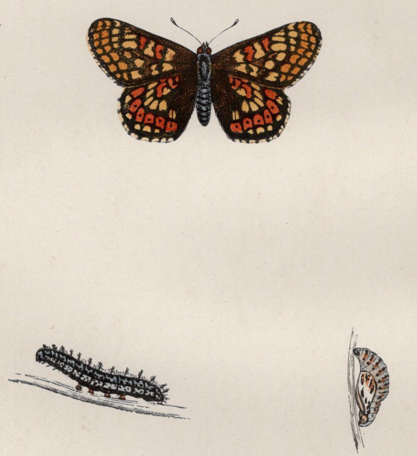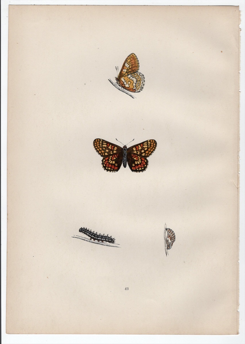 1890年 Morris 英国蝶類史 木版画 手彩色 Pl.43 タテハチョウ科 エウフィドリアス属 マーシュヒョウモン GREASY FRITILLARY 博物画