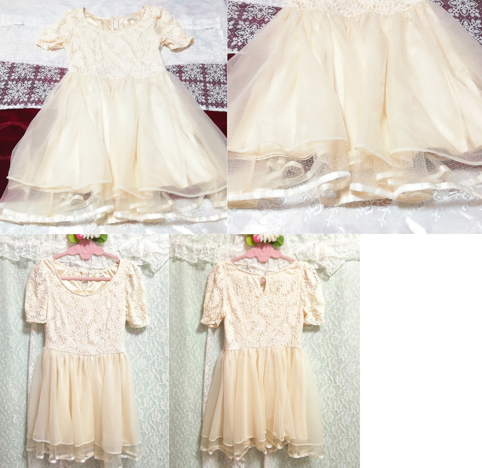フローラルホワイトレースチュールスカート ネグリジェ 半袖ワンピースドレス Floral white lace tulle skirt negligee short sleeve dress
