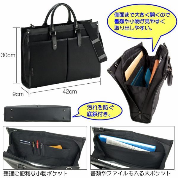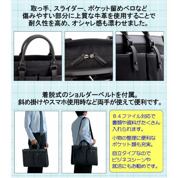 | 只今購入者に500ポイント(500円相当)プレゼント実施中!! 次回購入時にご利用が可能です! ●手触りの良いマイクロファイバーポリエステル製のワンランク上質なビジネスバッグ。 ●取っ手やスライダー、ポケット留めベロなど傷みやすい部分に上質な牛革を使い、使用感と耐久性を向上させました。 ●開閉部はダブルスライダーのファスナー仕様。両側面まで大きく開くので、書類や小物が見やすく取り出しや収納が簡単に行えます。 ●B4ファイルサイズ対応で書類をすっきり収納できます。 ◆サイズ : 横幅42×高さ30×厚み9センチ ◆素 材 : マイクロファイバーポリエステル ◆付属素材 : 牛革 ◆カラー : (01)黒 ◆本体正面 : 片ササマチ付き2分割ポケット ◆本体内部 : アテポケット、マチ付きオープンポケット、 小物ポケット(2ケ)、ペン差し ◆対応サイズ : B4ファイルサイズ収納可能 ◆その他 : 着脱式ショルダーベルト、底鋲付き ◆重 量 : 約860g | |