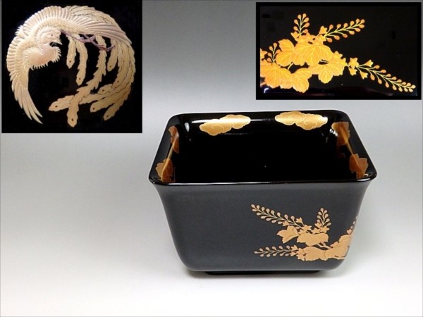 ★華心★ EEa-N155 時代黒地桐雲鳳凰蒔絵菓子器 (明治) 木製品