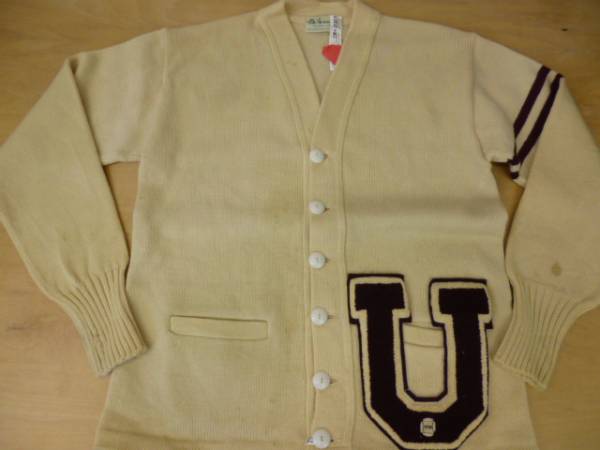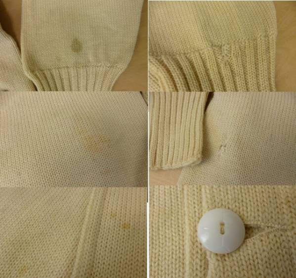 USED品で、レタードワッペンの右上部の縫いつけ部分に少しにほつれがあります。所々に若干の汚れ、染み、右袖リブとバック左腰に手縫いのリペアがあります。経年変化による微妙な擦れもあるかもしれません。(画像でご確認下さい。)着用に支障となるダメージ等ありません。当時の物としてはコンディション的に良いと思います。現状にご理解いただければまだまだ着用して頂けます。ヴィンテージ独特の風合いが出ております!