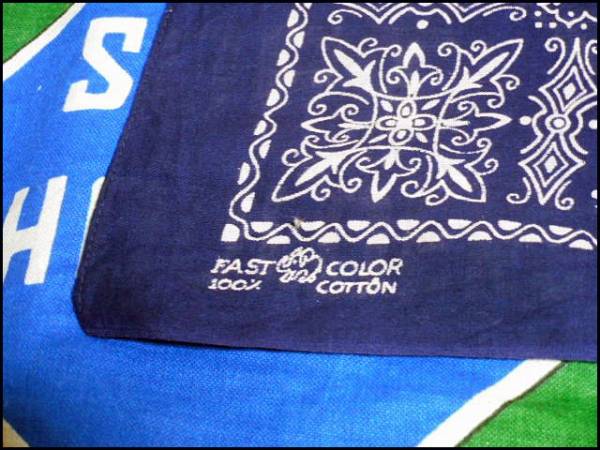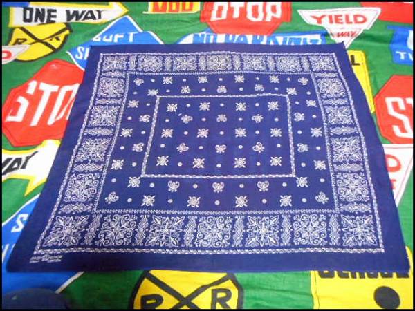 バンダナの専門書「ELEPHANT BRAND 2」の中では「ARROW HEAD(アローヘッド)」と紹介されている1枚で、鮮やかな濃紺ボディーにビンテージバンダナらしい柄のパターンがかっこいいです。