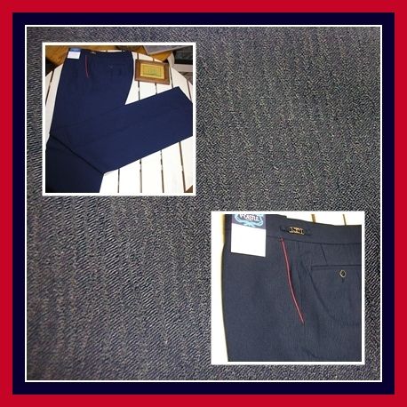 1970年代産のストレートぽい裾拡がり ジェントリ-フレァーシルエット。ネイビー色でシャドーファンシーパターンの織地。ビットストラップウエスト レッドパイピング Yポケットデザイン。素材は ポリエステル 100% のサラっとした穿き心地良い素材。薄地ですが年中着用可能生地。微光沢素材です。 サイズ(平置実測採寸)は ウエスト 79cm(表示 79cm) 渡り幅 32cm 腿幅(股下 10cmの所) 29cm 腿幅(一番細い所) 24cm 裾幅 24,8cm 前股上 27,5cm 股下(フリー状態) 89cmですこちらは、こだわりの優れた縫製の日本製品です。 勿論 新品ですので、お好きな長さで 修理し 着用可能です。そして、御希望により 裾上げ修理なども 実費にて承ります。尚 毎週 木 日曜日は業務定休日で御座います。ご連絡御発送とも休業日明けにずれ込む事御了承下さい。