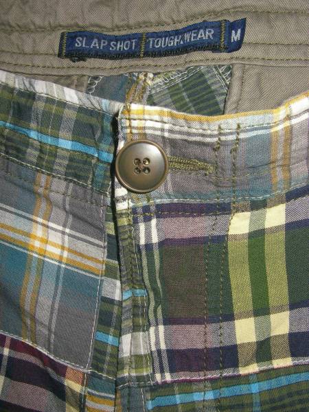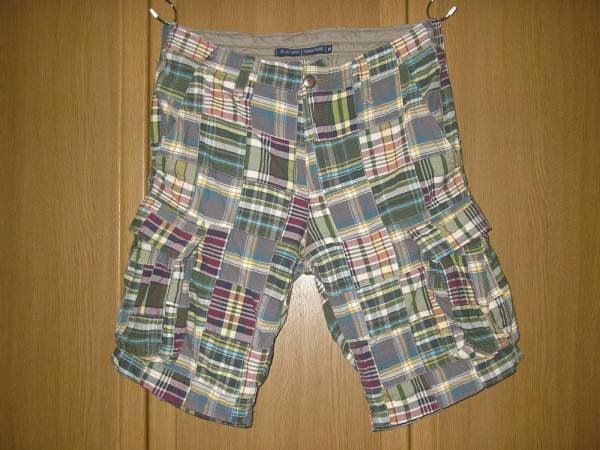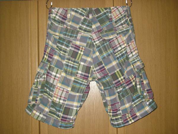 日本製、スラップショットのマドラスチェック柄のパッチワークカーゴショートパンツです。綿100%のいい生地です。サイズは、メーカー表記Mサイズで、平置き採寸で、ウエスト42センチ、前股上29センチ、股下26,5センチ、太ももあたり28センチ、裾幅26センチです。素人採寸ですので多少の誤差はお許しください。若干の使用感ございますが、特に大きなダメージも無く、状態良好です。あくまで、USED品ですので神経質な方、パッチワーク物、古着のご理解のない方入札お断りです。