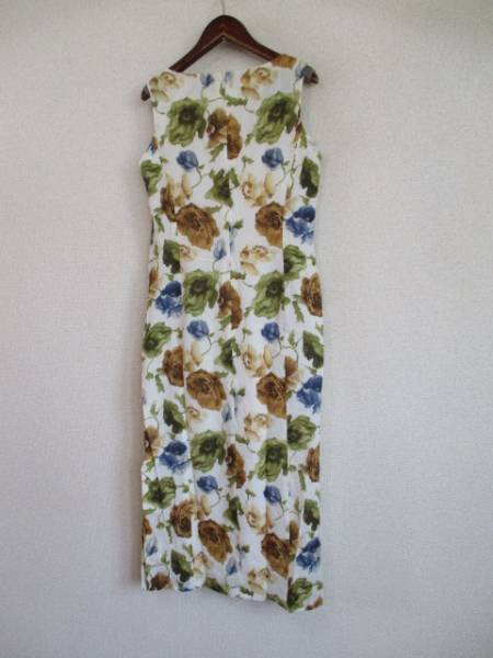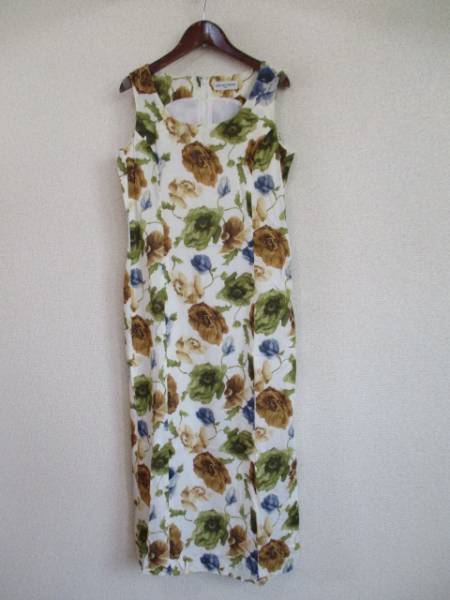 | 商品紹介 | 大きめの花柄がオシャレなノースリーブワンピースです。 地色は白で、プリント部分はカーキ、茶、青などです。 切替えでウエストは軽くシェイプされていて、 左横に37cm程大きめにスリットが入っています。 ピッタリすぎない程度のタイトな形です。 《素材》 表地:綿100% 裏地:キュプラ ※割合の記載なし |