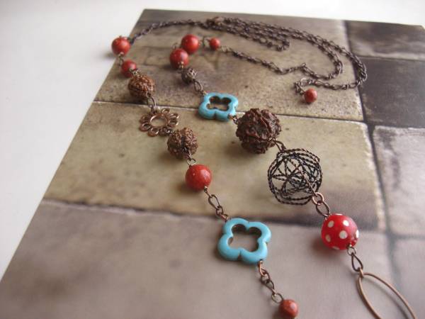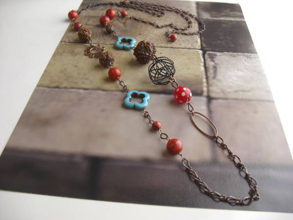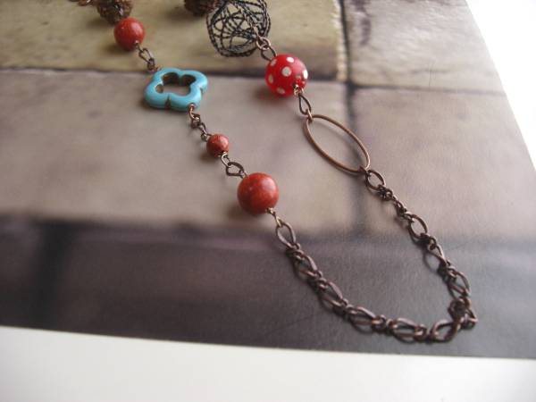 ルーズ・シルエット・・シリーズです♪チャイニーズ気分・・シックな赤のスポンジ珊瑚のネックレスです♪アンティークのとんぼ玉や爽やかなハウライト・ターコイズや菩提珠やワイヤーボールを合わせてオリエンタルな表情です♪ハウライト・ターコイズは18ミリ位のフラワーリングです♪スポンジ珊瑚は6ミリから10ミリ位までの丸玉、菩提珠は10ミリ、12ミリ位です♪とんぼ玉は11ミリ位です♪長さは全長108センチ位で調節自由です♪2連にされても素敵です♪お揃いのブレスレットやイヤリングも出品しています♪♪シンプルで飽き のこないいつまでも着けられるデザインを考えて作りました!ハンドメイドをご理解頂いてノークレーム、ノーリターンでお願いします