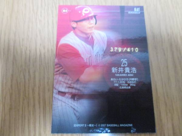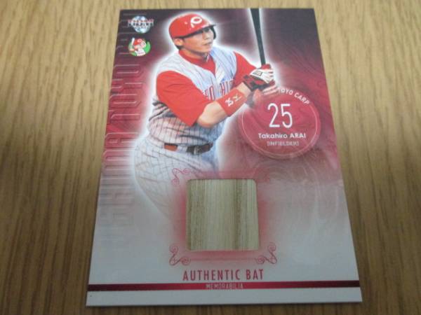 広島東洋カープ所属。新井貴浩・ゲーム{以前広島に所属していた時代に}実使用バットの一片がカードにインサートされたカード。シリアルナンバー379/410。