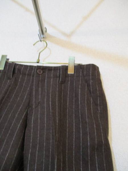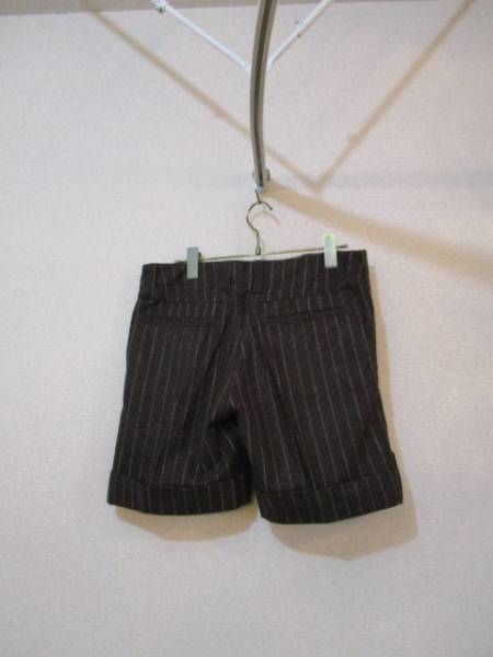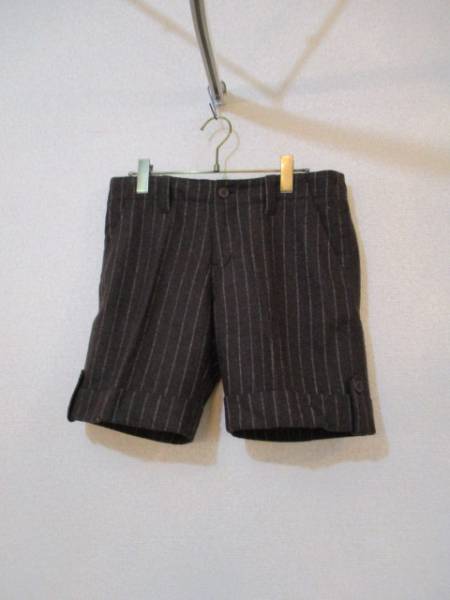 商品紹介 | 濃茶の地色に白いラインが入ったストライプのショートパンツです。 裾は1回折り返していて、スッキリとした形です。 裏地が付いているのではきやすいです。 《素材》 表地:ウール40% ポリエステル60% 裏地:ポリエステル100% |