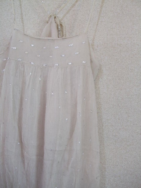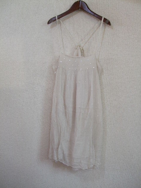 | 商品紹介 | シワ加工が施された透け感のあるシフォンがオシャレな キャミソールワンピースです。 シフォン生地にシルバーの細長いテープが付いています。 肩紐は後ろ側、1ヶ所で結ぶデザインです。 裏地の裾にレースが付いて、表地から見えるようになっています。 本体はクリームがかった少しくすんだ白です。 《素材》 表地:レーヨン100%(スリット糸使用) 裏地:レーヨン70% 綿30% 裾レース:ナイロン100% |