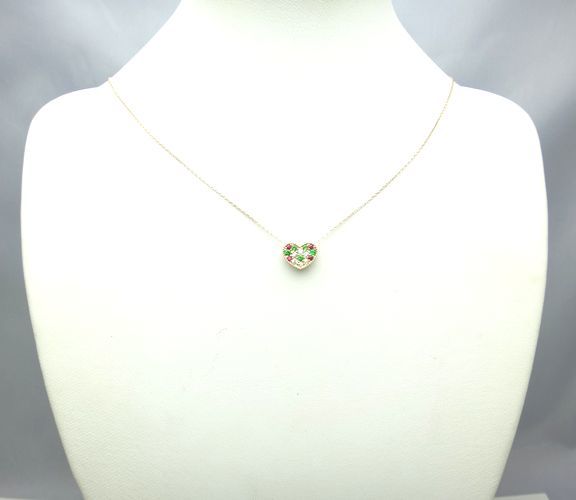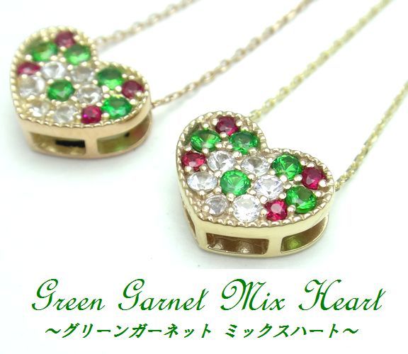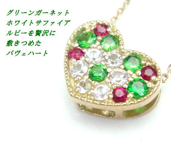 【40cm】K10PG グリーンガーネット カラフル ミックス パヴェ ハート ペンダント ネックレス ジュエリー 1月 誕生石 ミル打ち 箱付き