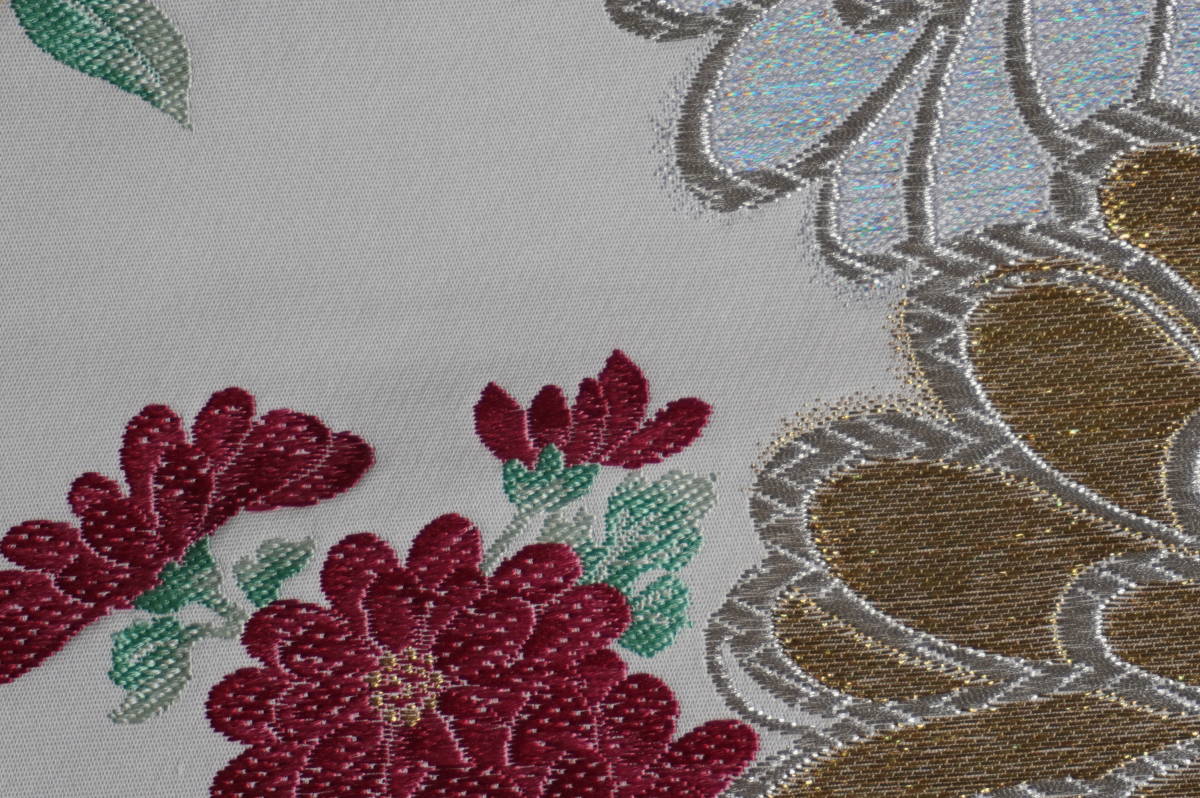 京都西陣 じゅらく の 若向きよう(振袖、訪問着、付け下げ、無地、小紋、など向き)のTOPブランド品『花かるた(花かおり、京ふり)』ブランドです。6通柄袋帯 新品未仕立て品、絹100%金属糸等使用  白系色(裏地しろクリーム)の銀の生地にきくはな、、、