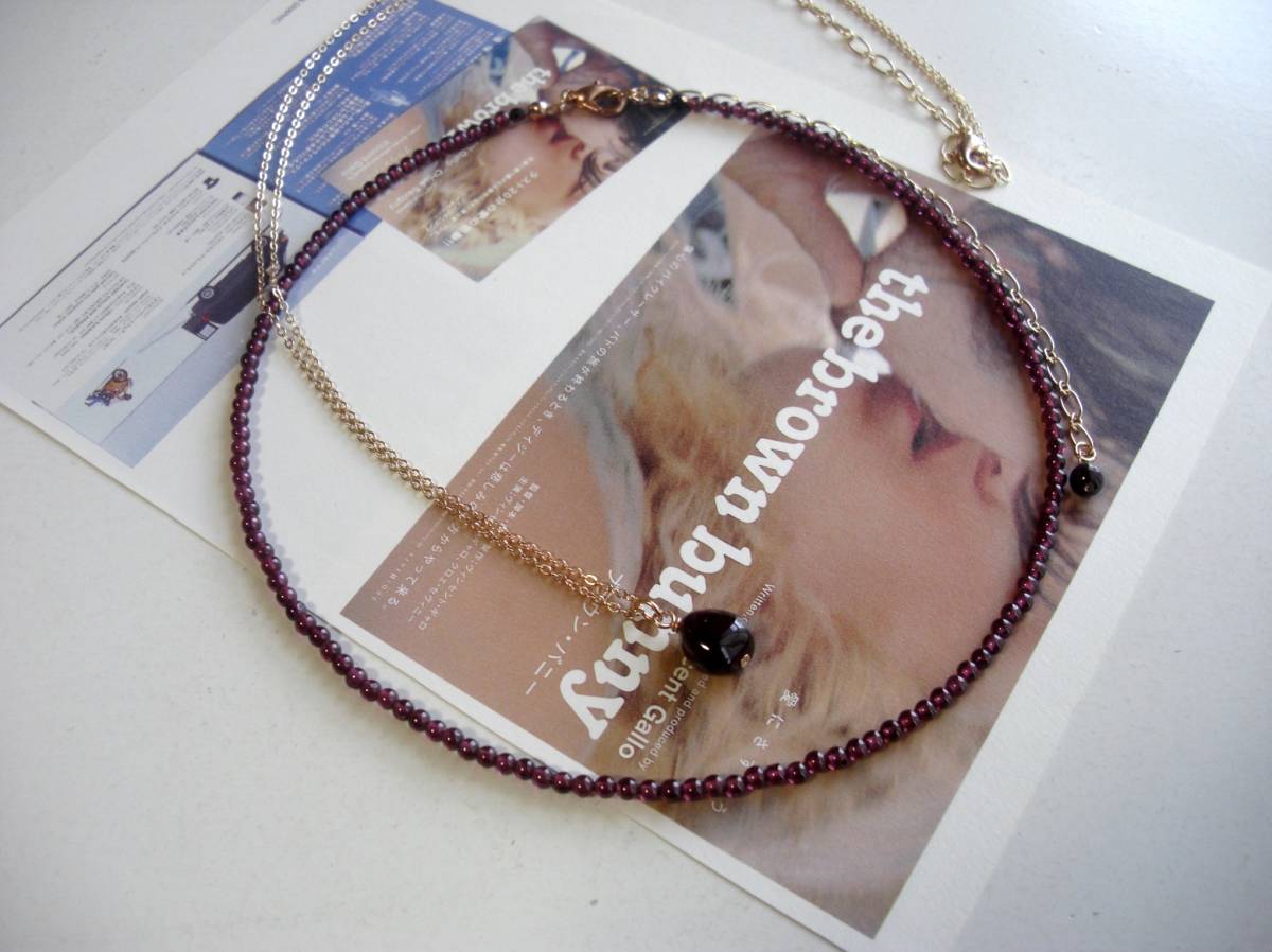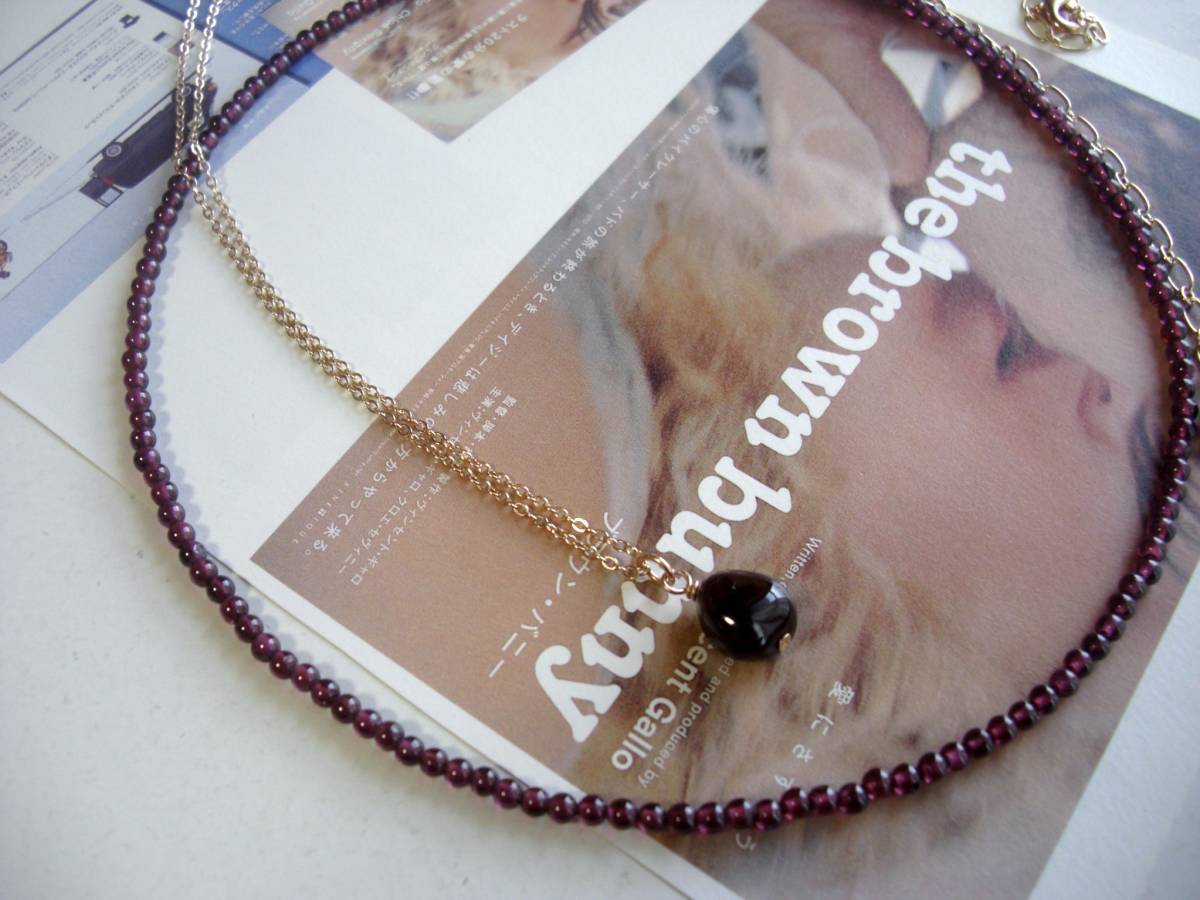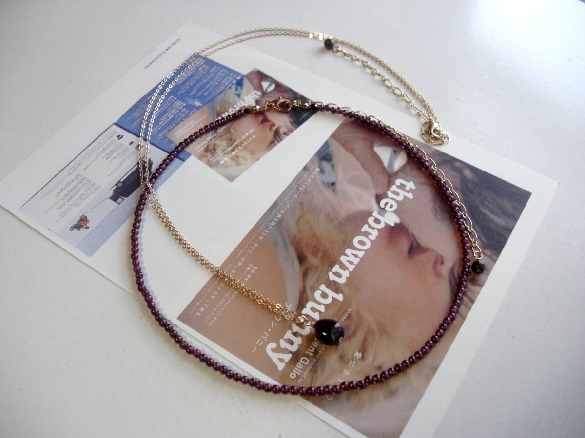 お揃いコーデ・・シリーズです♪ガーネット見本帖・・深い赤のガーネットのネックレス2点セットです♪小粒の丸玉やラフタンブルなどデザイン違 いのガーネットにピンクゴールドのチェーンを合わせて可憐な表情です♪シンプルなデザインは3ミリの丸玉のガーネットです♪長さは42センチ+アジャス ター13センチで全長55センチです♪10ミリ位のラフタンブルのガーネットは華奢なチェーンを合わせました♪長さは72センチ+アジャスター13センチで最長85セン チ位です♪♪それぞれ単品、ブレスレット、イヤリングも出品しています♪♪シンプルで飽きのこないいつまでも着けられるデザインを考えて作りました!ハン ドメイドをご理解頂いてノークレーム、ノーリター ンでお願いします