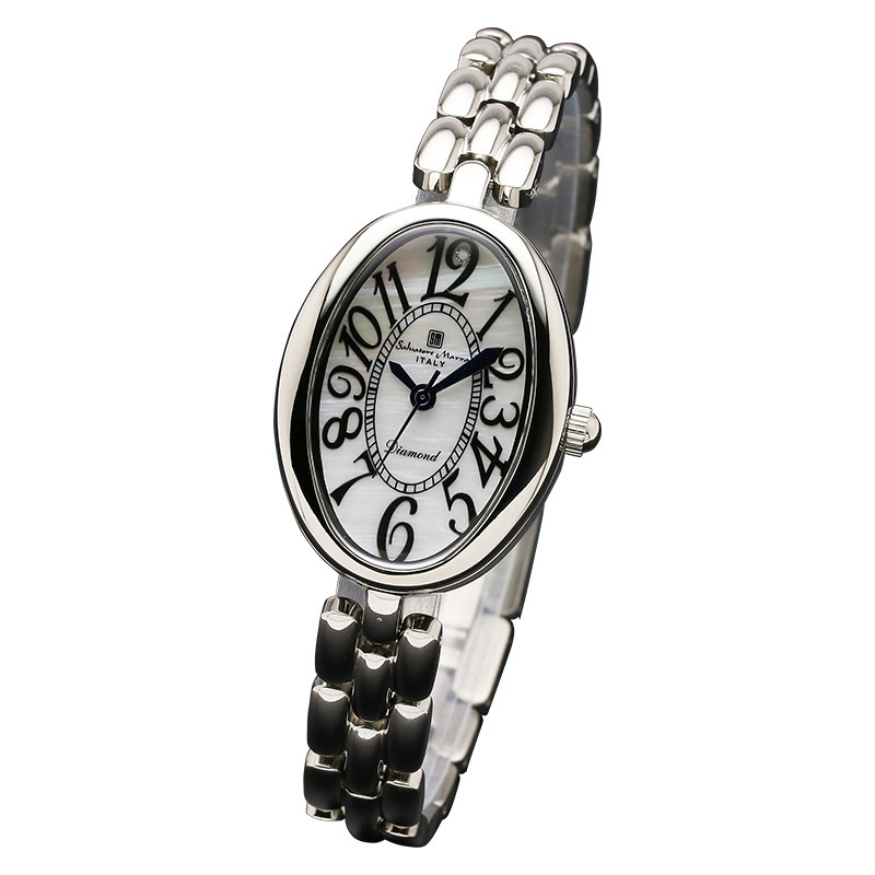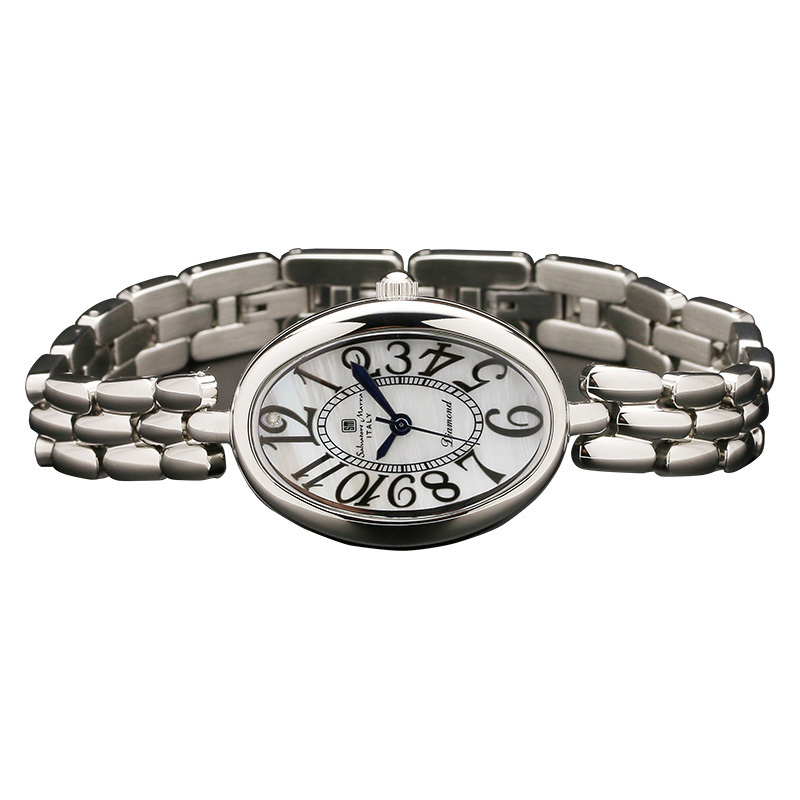 新品2年保証Salvatore MarraサルバトーレマーラSM17152SM17152-SSWH腕時計天然1PダイヤモンドレディースSalvatore Marraでは珍しい、レディースモデル。慎ましやかに主張する。オーバルケースにあしらわれた一粒のダイヤモンド。そして心臓部に採用したのは約10年の寿命を持つ電池を搭載したムーブメント。それは、普遍性を目指した想いの現れです。ムーブメント:日本製クォーツ10年電池(電池式)3気圧防水12時位置に1ポイントダイヤモンドMOP文字盤ベルトアジャスター付風防:ミネラルクリスタルガラスケース素材:ステンレスベルト素材:ステンレスケースカラー:シルバーベルトカラー:シルバー文字盤カラー:シェル文字カラー:ブラックケース:約32mm(リューズ除く)ケース厚:約10mm腕周り:約-19cm付属品専用ケース一式・取扱説明書一式・保証書(ギャランティーカード)一式