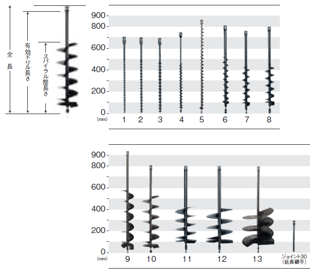 | エンジンドリルに取り付けることで、深い穴を効率よく掘ることができます。 用途に合わせて穴径をご選択ください |