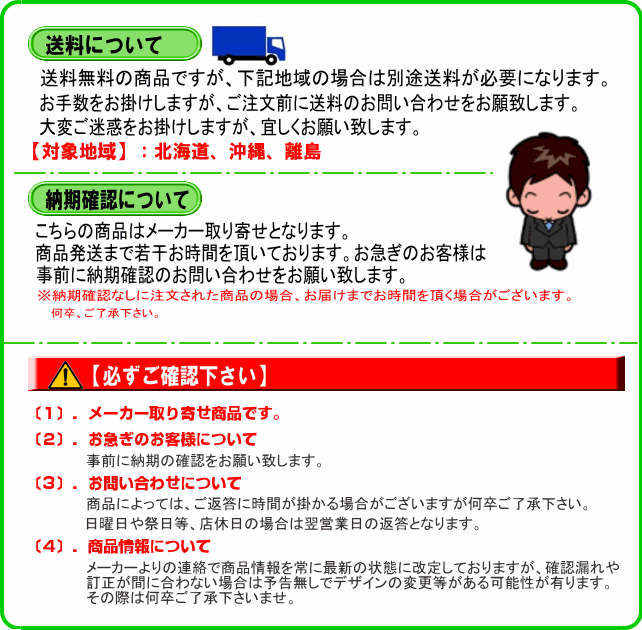 | 重量物や長尺商品につきましては、お届先の道路状況やメーカー提携運送会社の 配送車両の関係でご指定ご住所まで配達が出来ない場合がございます。 該当商品をご落札予定の場合は事前に配送が可能かのお問い合わせを頂ければと 思います。 |