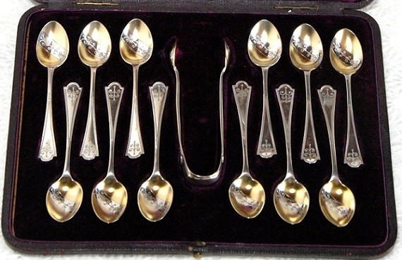 アンティーク 1879年 純銀製、美しいスプーン12本&トングセット(l-58)