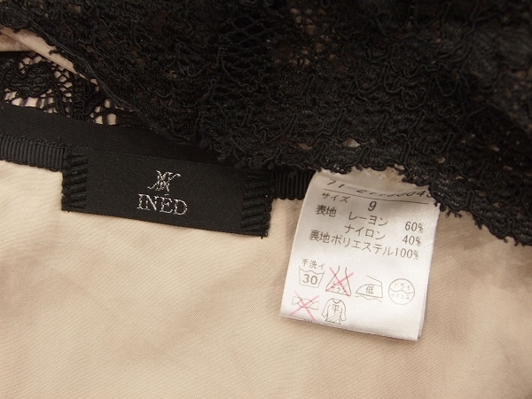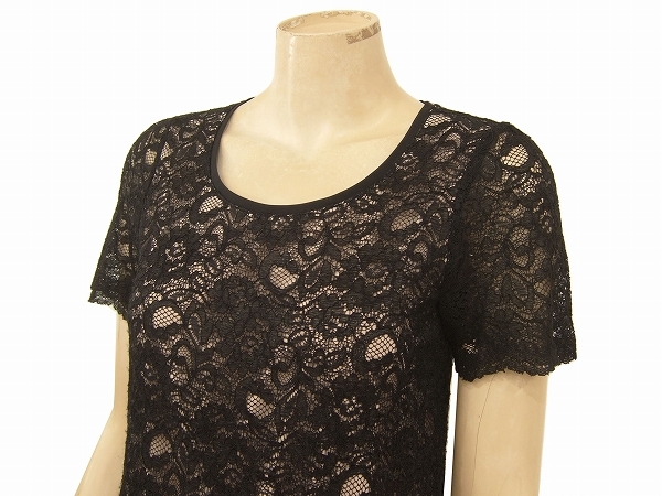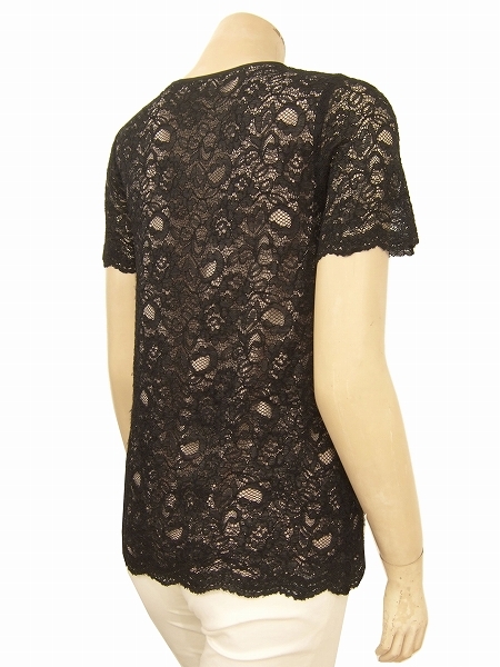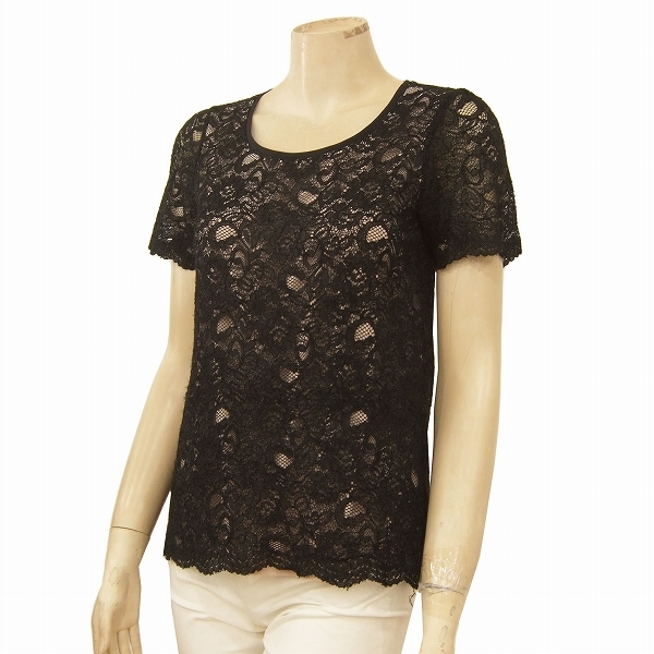 U美品★イネド*INED★万能黒色★華やかレース★ラウンドネック★半袖★美女ブラウス★9号(M・38号)/レディース