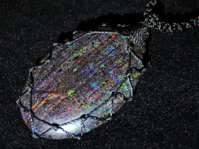 ブラックオパールの特性として、地がグレイ~黒なので日陰や室内では本来の輝きを内に秘め隠しています。