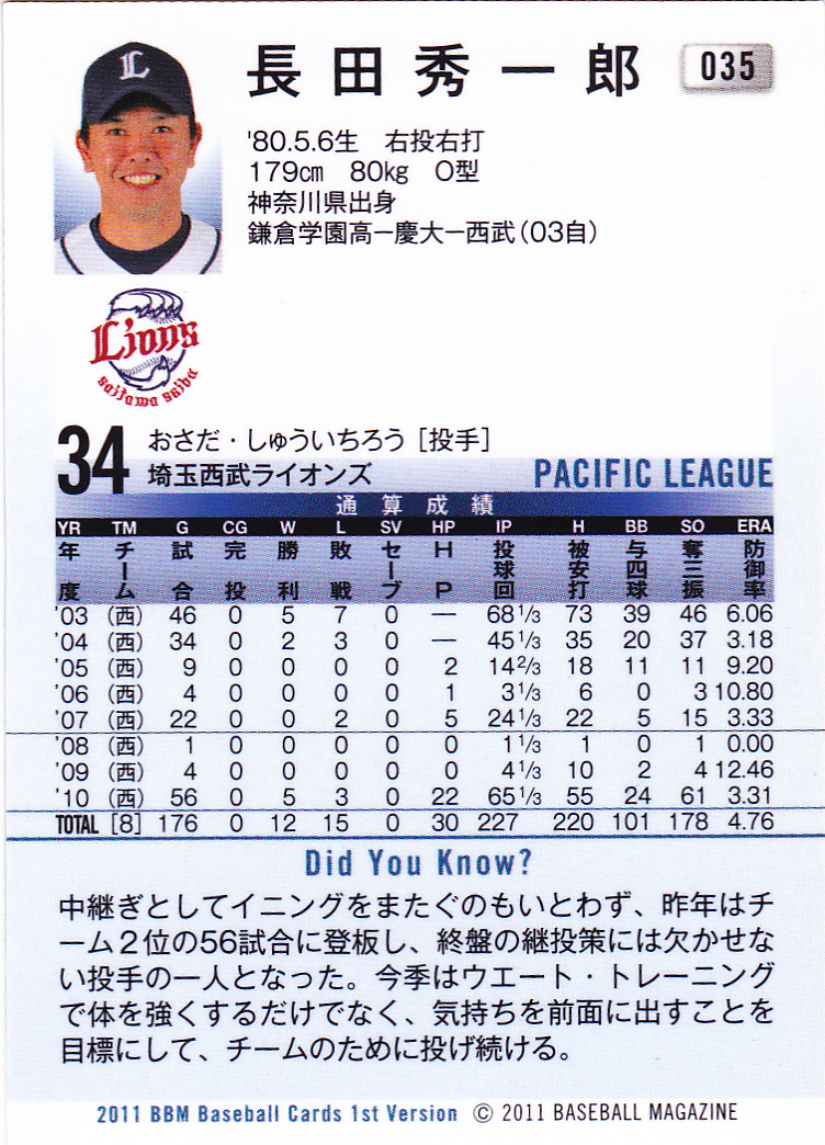 2011BBMベースボールカード1st 035 長田秀一郎 西武ライオンズ 神奈川県 鎌倉学園高校 慶応大学