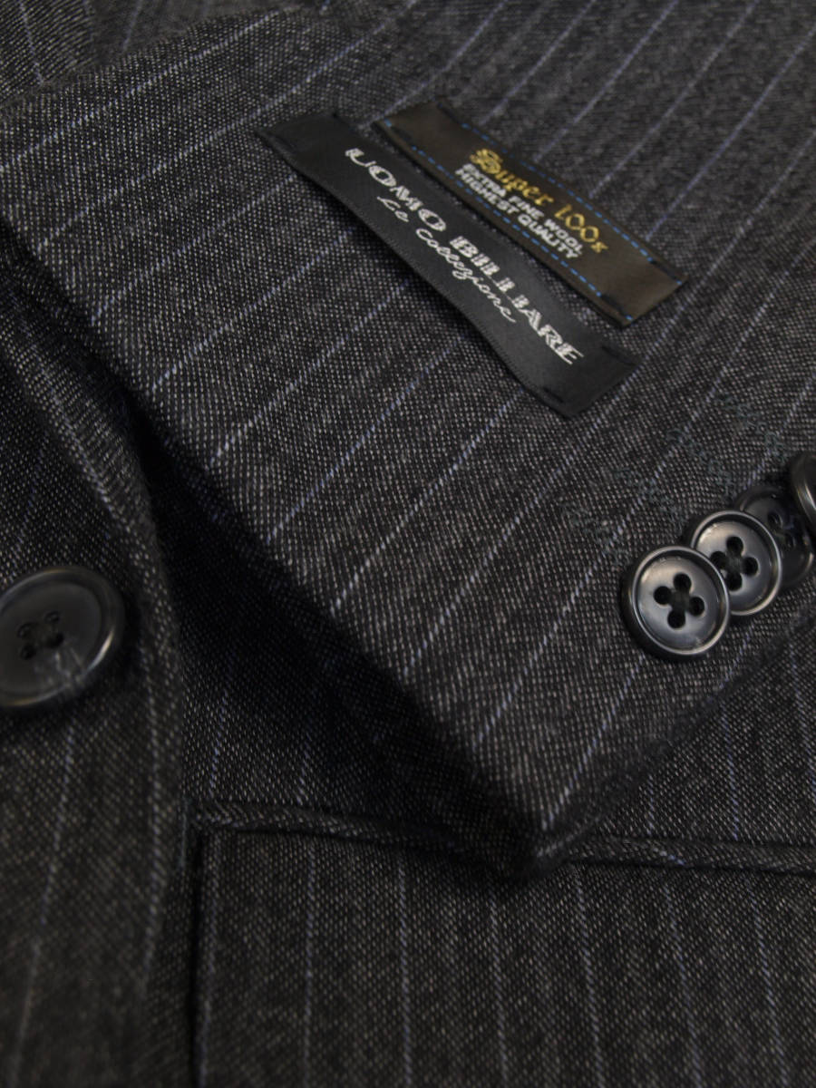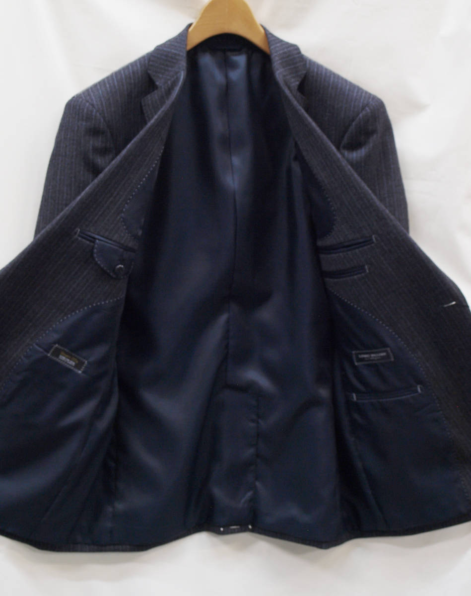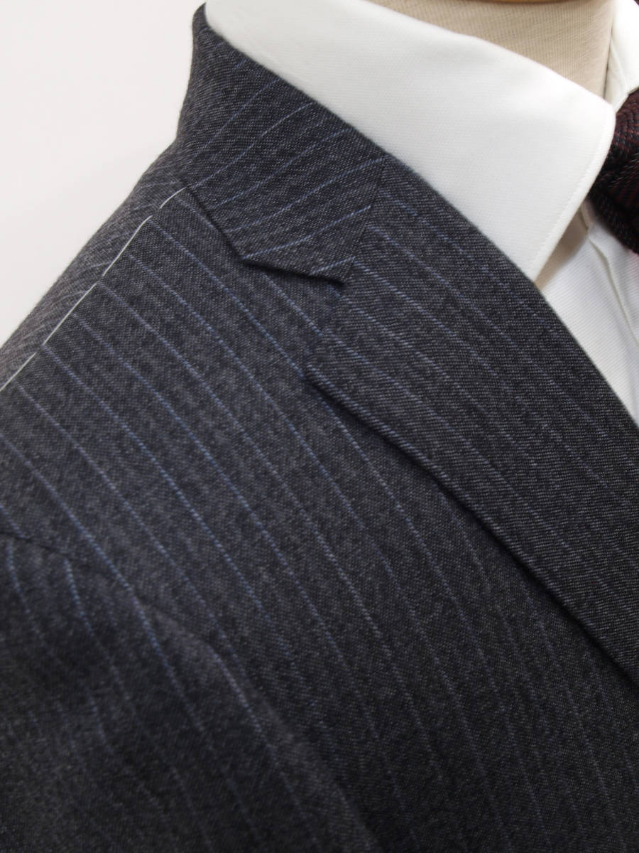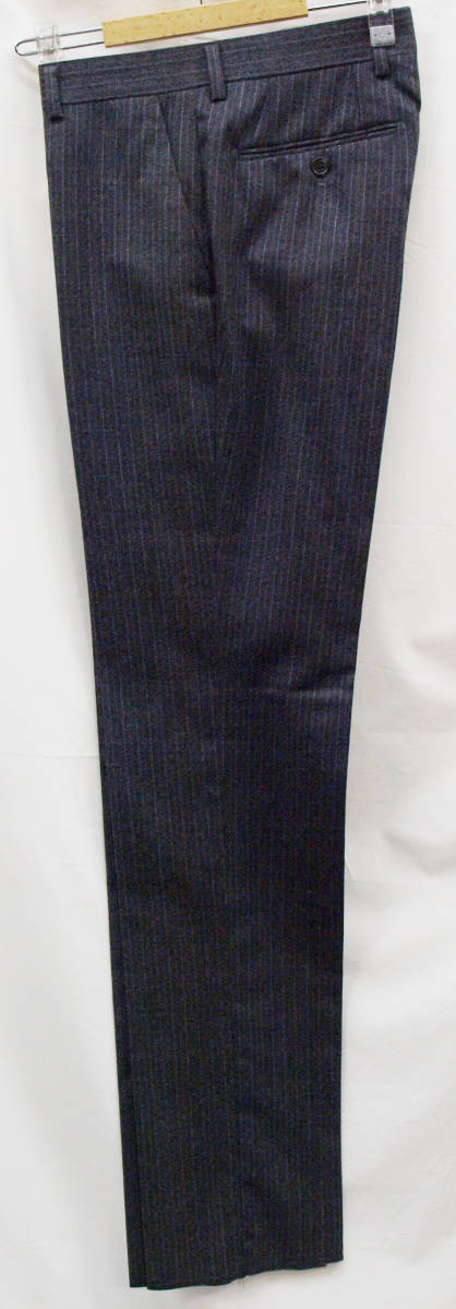 【サイズ】 A4 ( AS号相当) 目安の体型 身長160cm~170cm、ウエストサイズ78cm前後 【ジャケット実寸】 肩幅44.5cm 着丈68.5cm 袖丈58cm 脇下部分49cm 身幅45cm 【パンツ実寸】 ウエスト(胴回り実寸)78cm (平置きでかるくはかると78cmでひっぱってはかると80cmです。) わたり幅31cm 股下10cm部分28cm 裾幅19.8cm 脇股上23cm 前股上23.5cm 股下88cm(裾上げしていない状態/新品) 【素材】 表地:ウール(毛)100% 裏地:胴裏/ポリエステル100% 袖裏/ポリエステル100% ・秋冬向け紳士スーツ用の上質なスーパー100ウール生地を使用 【色】 ミックスグレー 【柄】 ブルーとうっすらとしたグレー使いのストライプ柄 【デザイン】 すっきりとしたシルエット、タイトフィットスリム、ビジネススーツ新品、裾上げしていない状態です。 ・ジャケット:シングル2つボタンで細身のスリムモデル ・パンツ:股上は浅めのすっきりシルエットのノータックスリムパンツ 秋口~冬~春先にかけて秋冬メインのシーズン対応商品 【縫製仕様】 ・ジャケットはシングル2つボタン、ノッチドラペル、襟縁等AMFステッチ入り、袖口ボタン4つ、センターベント、内ポケット4つ(小ポケット2つ含む)、総裏地(秋冬物) ・パンツはノータック、膝裏当て付き、脇ポケット斜め付け、後ろポケット左のみボタン付き、フロントはファスナーでホック仕様/うちかけボタンあり きちんとしたビジネス仕様の縫製仕立てで仕上がっております。
