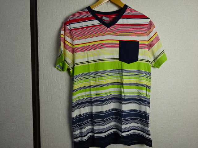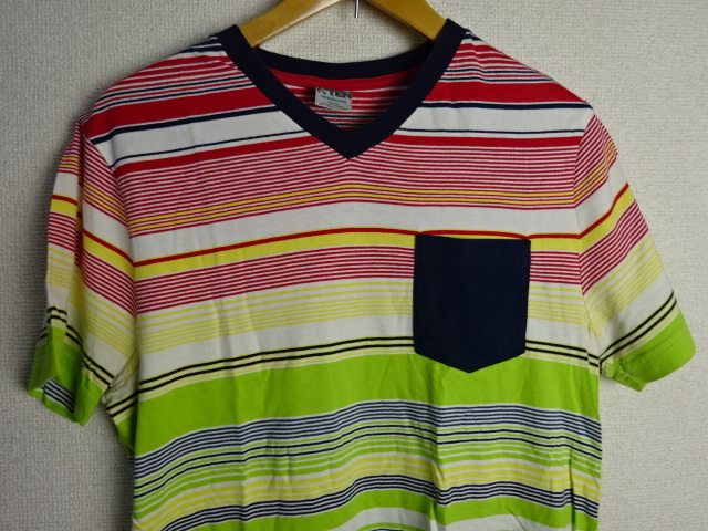 USED美品☆HANG TEN☆VネックマルチボーダーポケットTシャツ♪サイズM