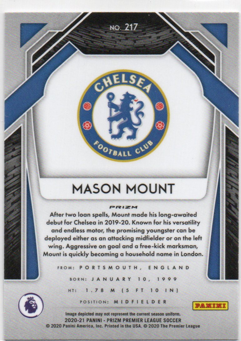 2020-21 Panini Prizm Premier League Soccer EPL、カードNo.217「MASON MOUNT」 Breakaway Silver Prizm(プリズム・リフラクター)カードです、四つ角、エッジ、センタリング、サーフェイスも状態良好です。