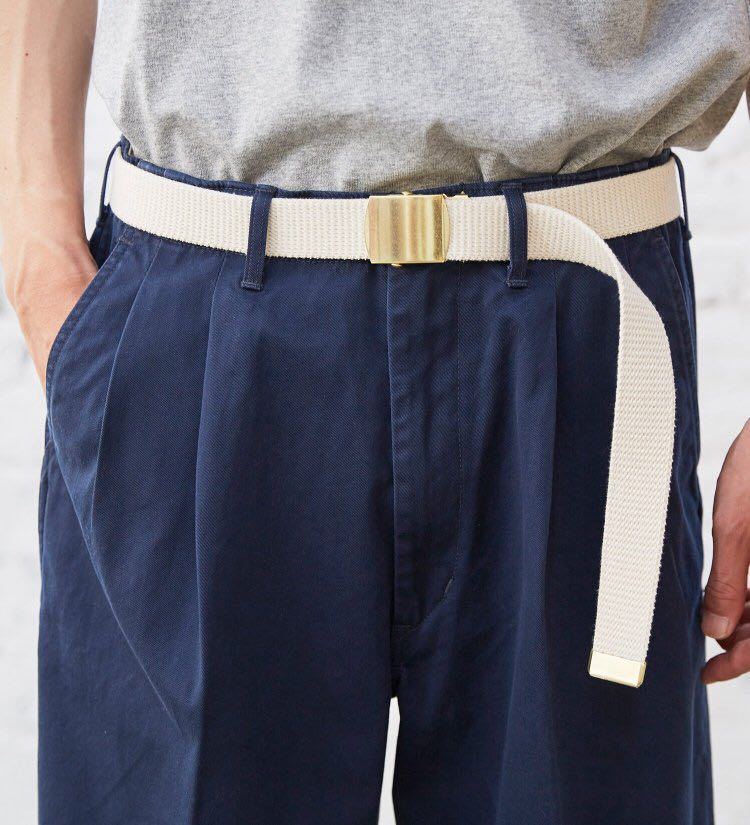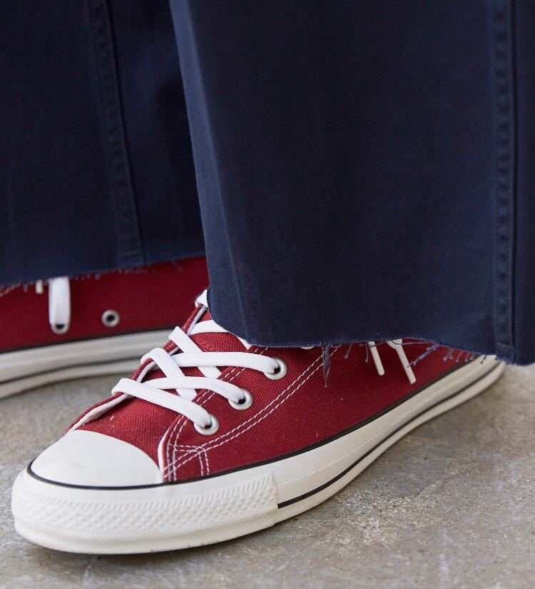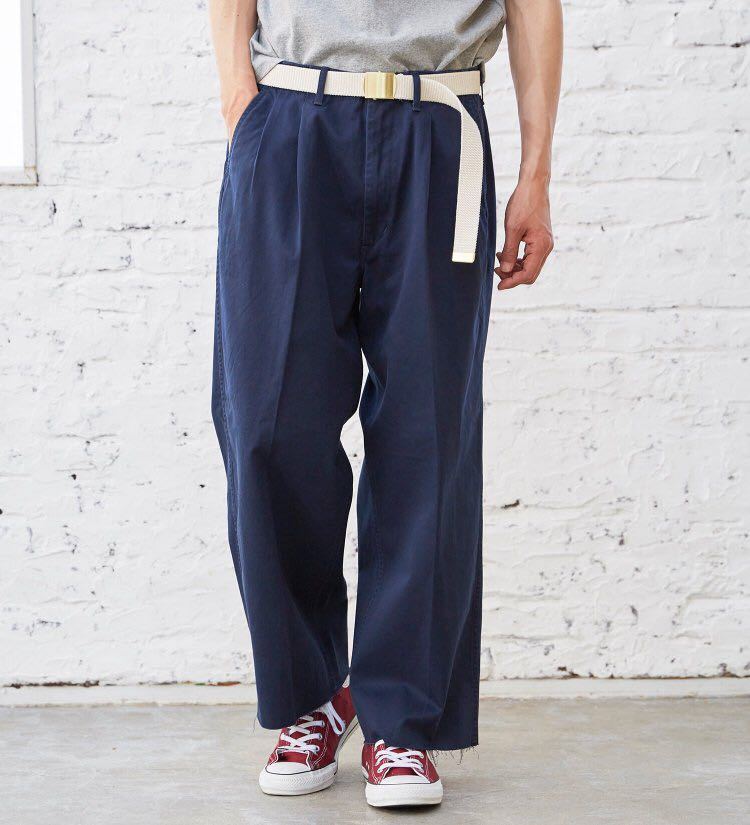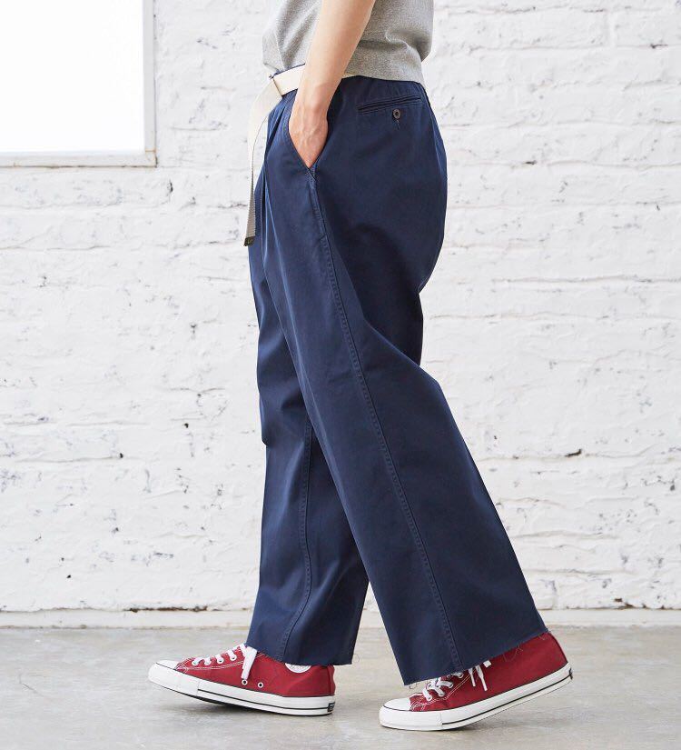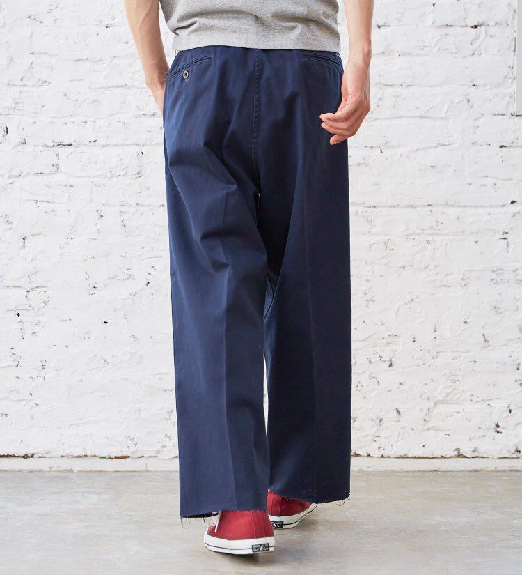ストンと落ちるワイドなシルエットに、センタープレス・切りっぱなしのスソ仕様・ウエストタック入りで、技ありのパンツ。