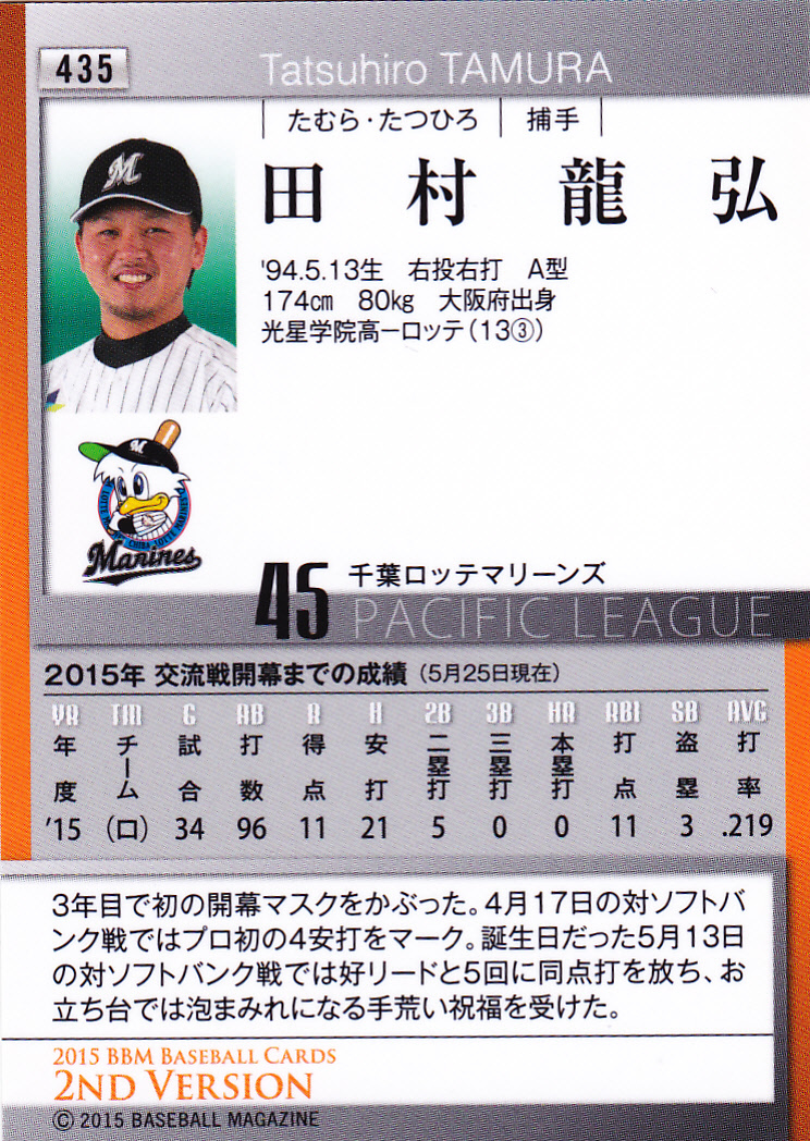 BBM2015ベースボールカード2nd 435 田村龍弘 大阪府 光星学院 千葉ロッテマリーンズ