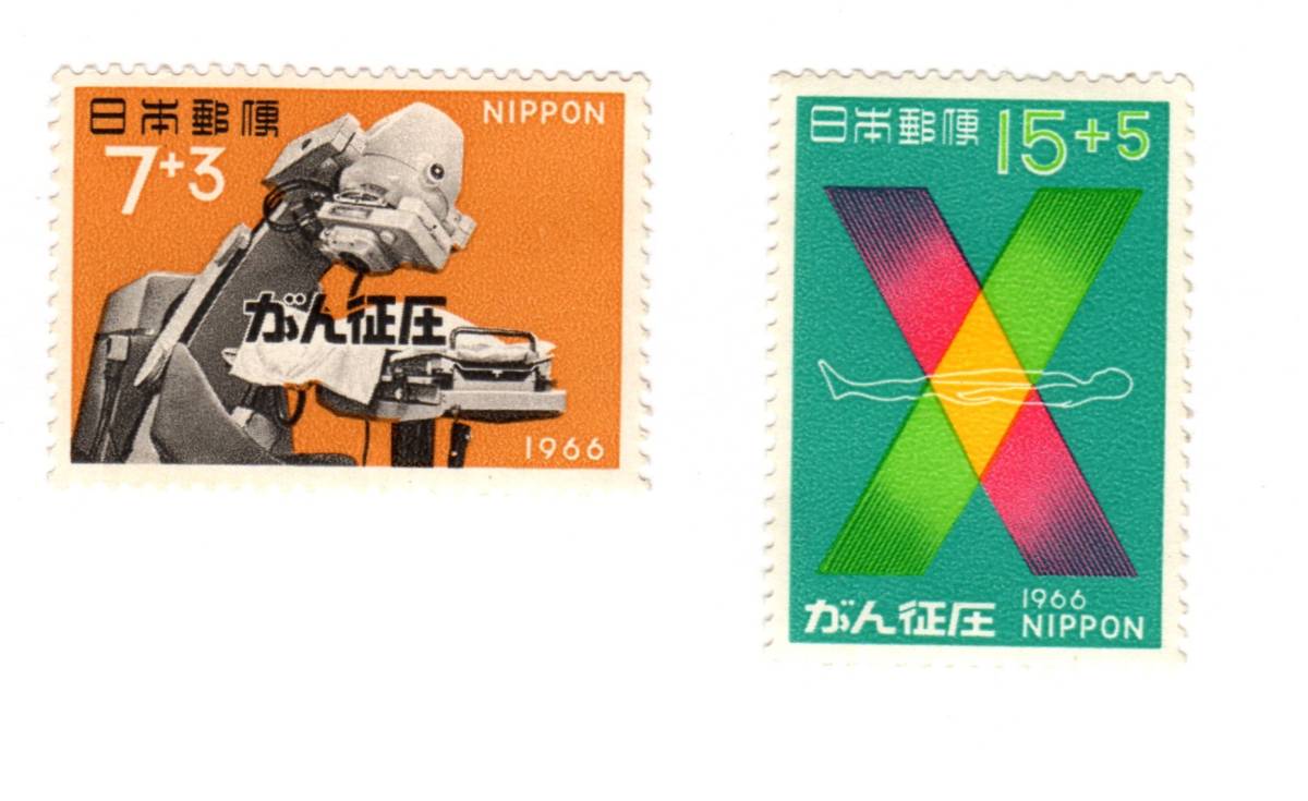 昭和41/1966 がん征圧運動/回転式コバルト照射機~レントゲンを表す記号と患者 7+3円/15+5円寄付切手2枚 未使用 送料無料 熊五郎の切手 356