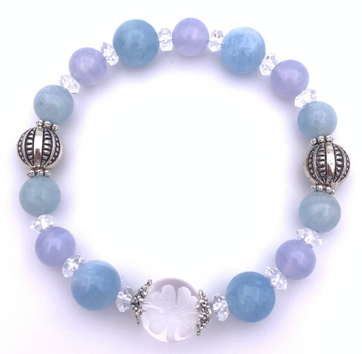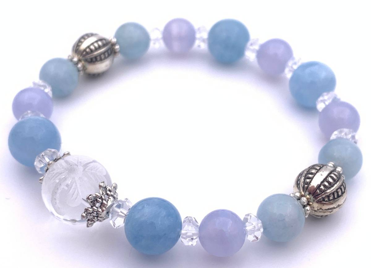 天然石彫り水晶四葉のクローバー&アクアマリン&ブルーレースのブレスレット