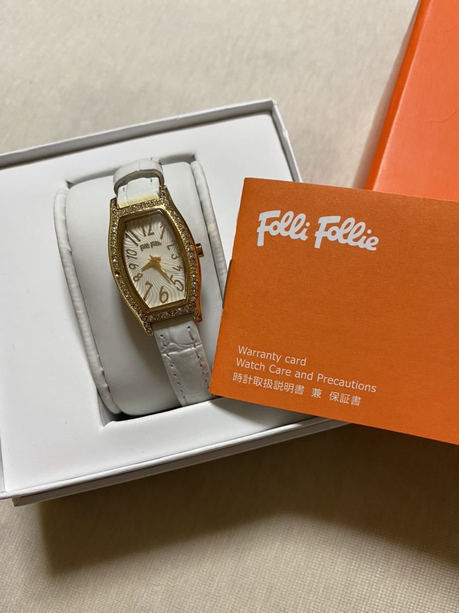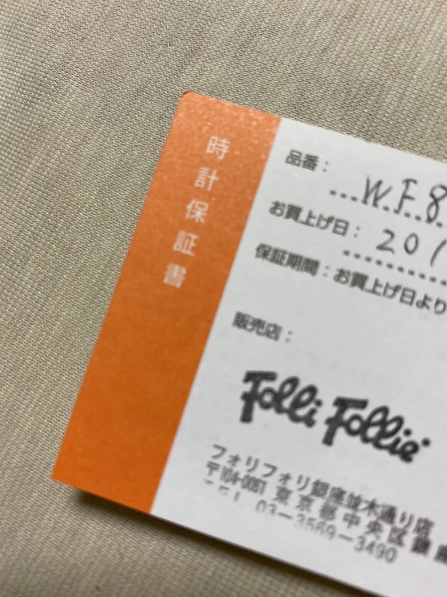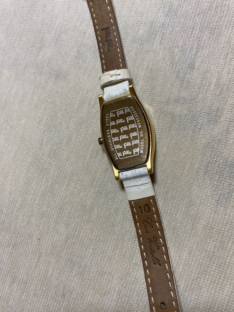 皮ベルトはフォリフォリで2019年7月に正規純正品で交換済みです。ベルト交換の際にもともと新しいベルトにはまっていた金具はシルバーですがそのまま付属品としてお付けします。ベルト通しの穴に若干の傷がありますが、それ以外はスレや汚れもなく綺麗な状態です。