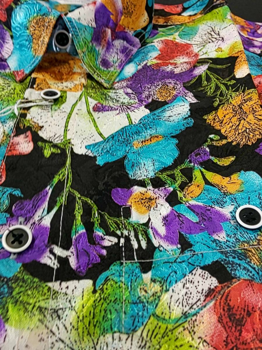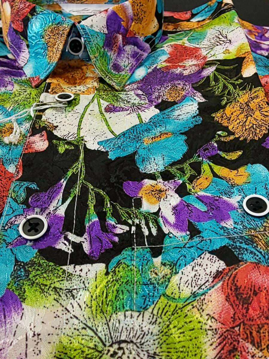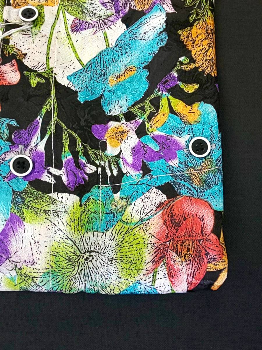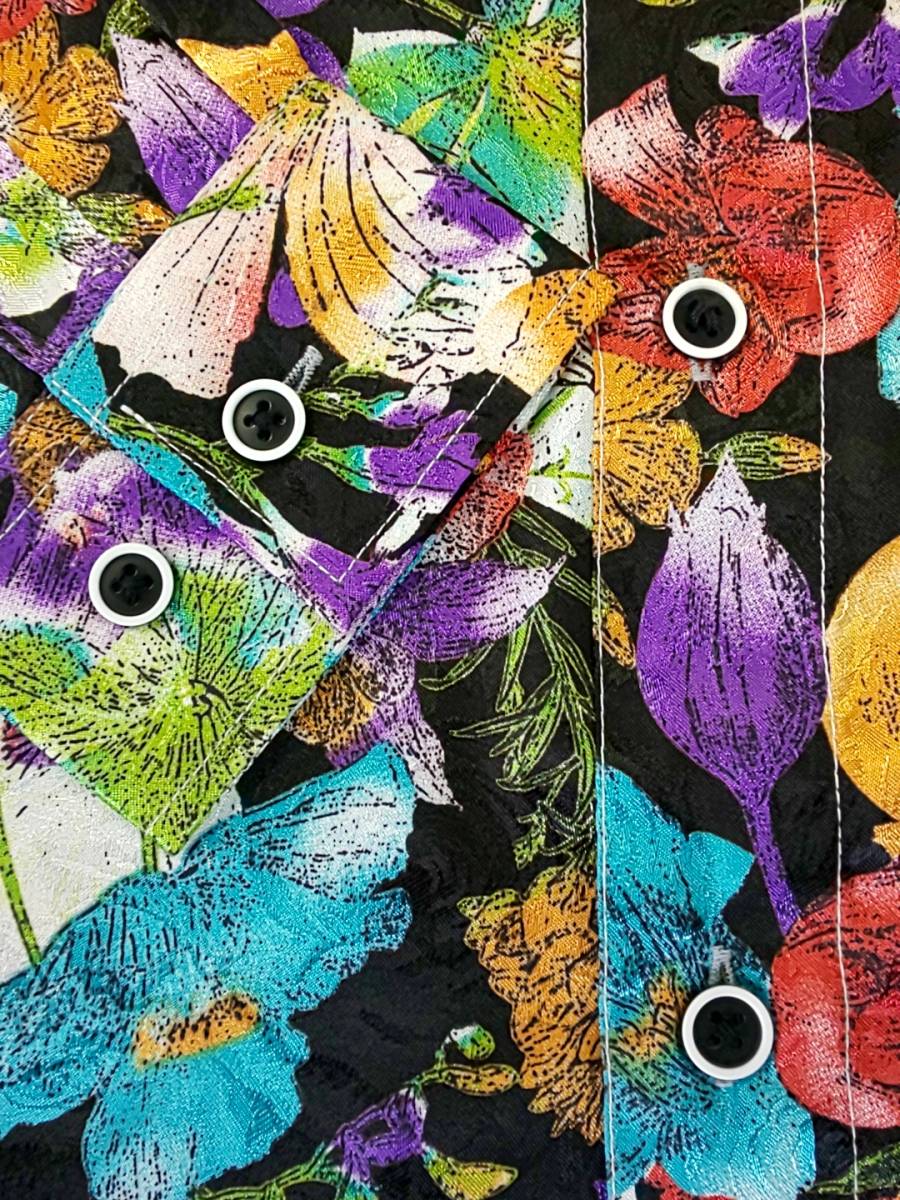 黒ベースの光沢あるジャガード織り地にカラフルな大きな花柄プリントがインパクトある商品です。